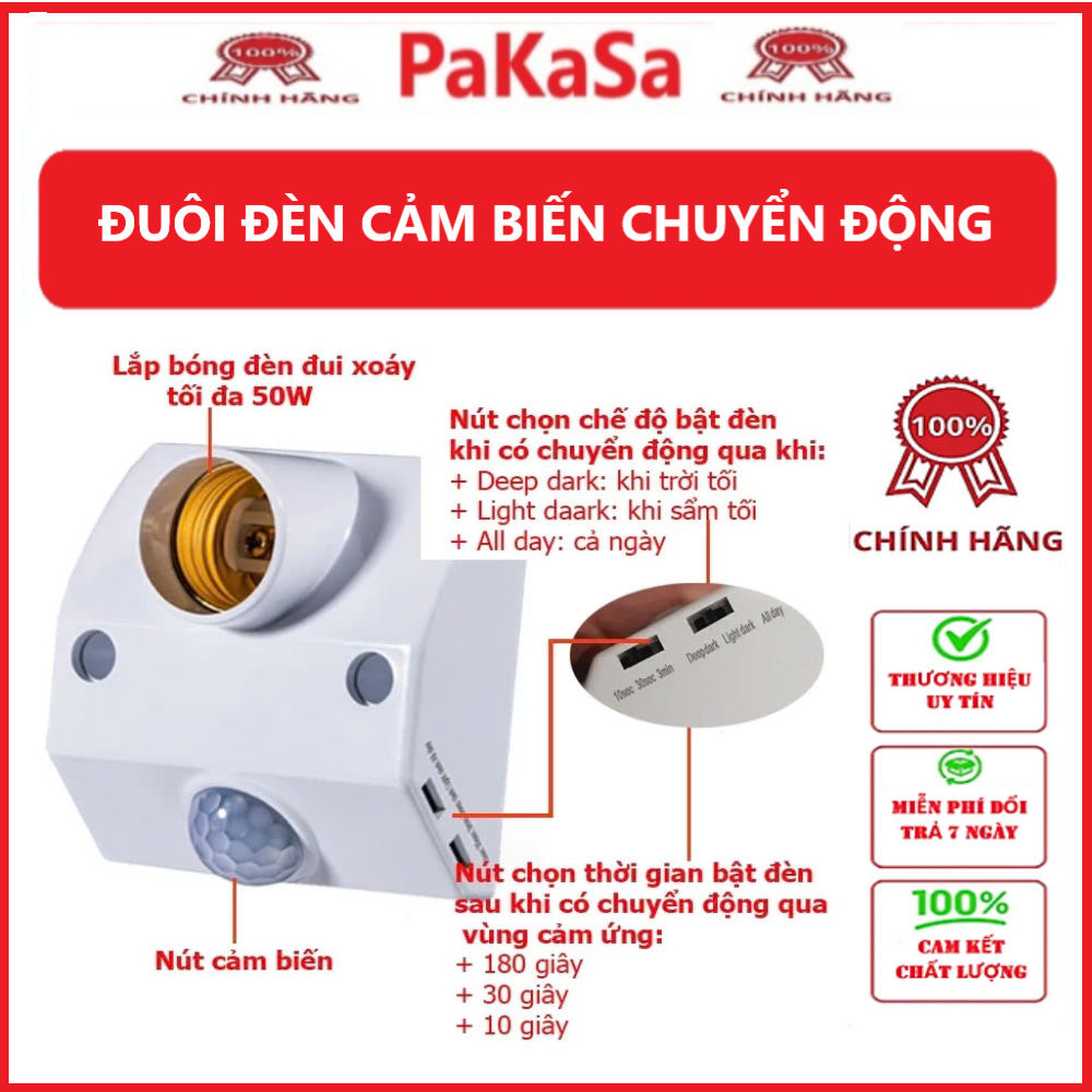 Đui đèn tự động mở đèn khi có người chuyển động trong vùng cảm ứng (chú ý: đui có cảm biến ánh sáng nên chỉ bật tắt đèn khi có người qua lại vào lúc trời tối ánh sáng dưới 10Lux ban ngày trời sáng khi có người qua đui đèn sẽ không tự động bật sáng để thiết kiệm điện. Có thể điều chỉnh cảm biến ánh sáng trong khoảng 5Lux – 5000Lux giúp ta có thể bật/ tắt đèn khi sáng tối tùy mục đích sử dụng)