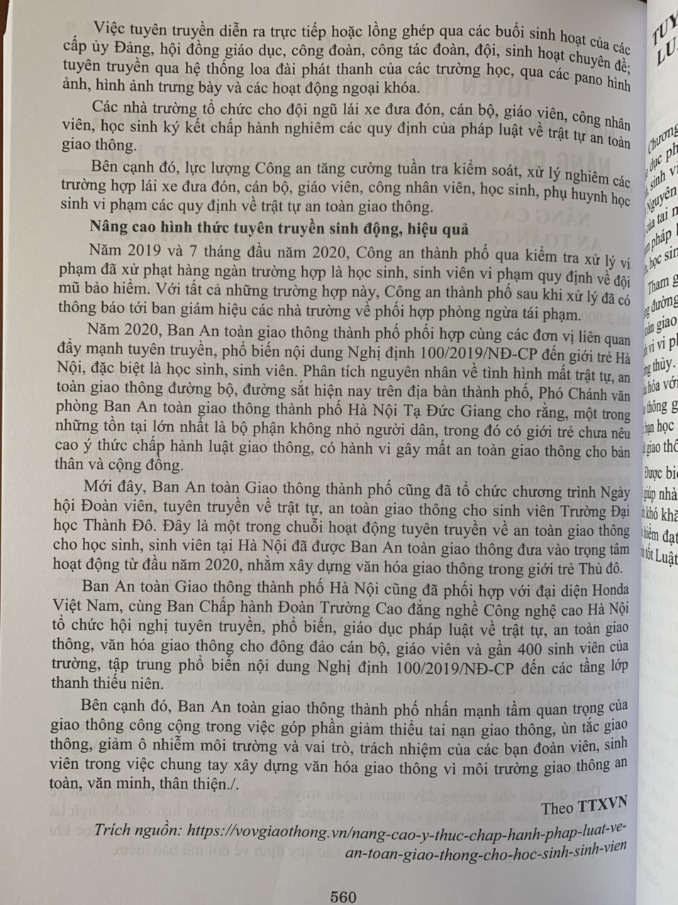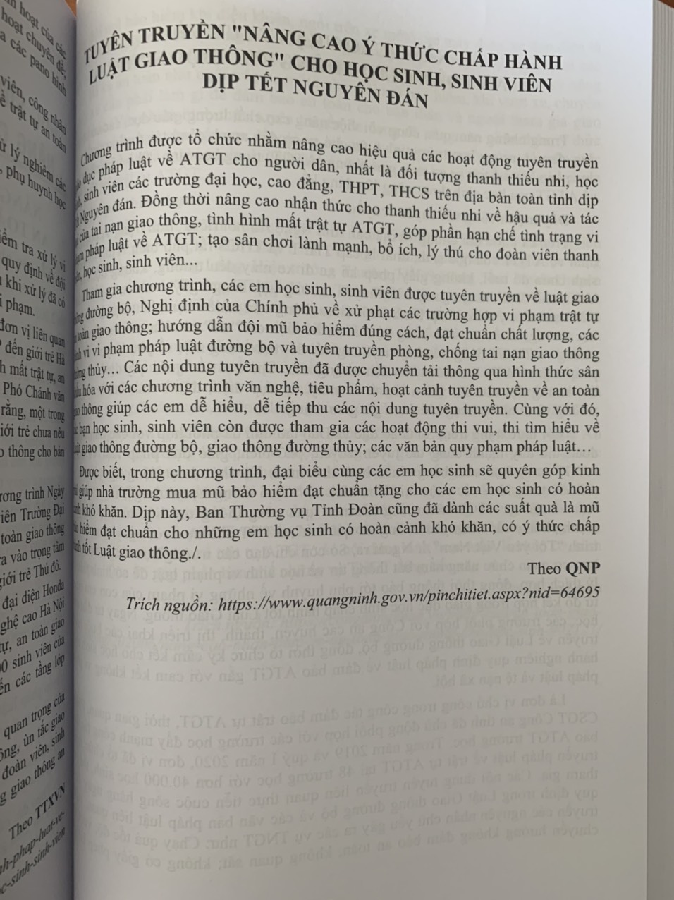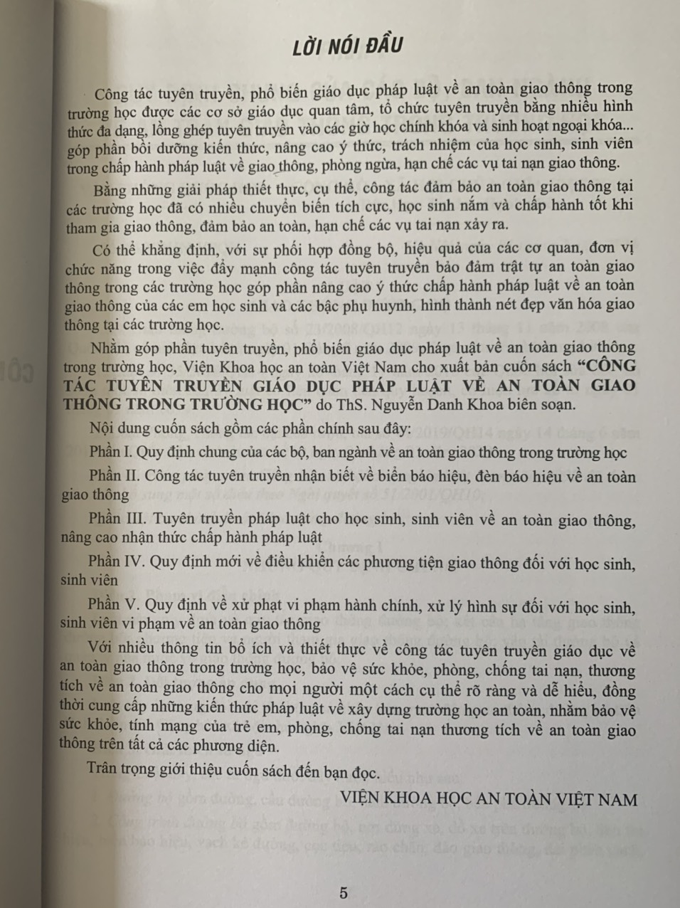 Công tác tuyên truyền, phổ biến giáo dục pháp luật về an toàn giao thông trong trường học được các cơ sở giáo dục quan tâm, tổ chức tuyên truyền bằng nhiều hình thức đa dạng, lồng ghép tuyên truyền vào các giờ học chính khóa và sinh hoạt ngoại khó góp phần bồi dưỡng kiến thức, nâng cao ý thức, trách nhiệm của học sinh, sinh viên trong chấp hành pháp luật về giao thông, phòng ngừa, hạn chế các vụ tai nạn giao thông. Bằng những giải pháp thiết thực, cụ thể, công tác đảm bảo an toàn giao thông tại các trường học đã có nhiều chuyển biến tích cực, học sinh nắm và chấp hành tốt khi tham gia giao thông, đảm bảo an toàn, hạn chế các vụ tai nạn xảy ra. Có thể khẳng định, với sự phối hợp đồng bộ, hiệu quả của các cơ quan, đơn vị chức năng trong việc đẩy mạnh công tác tuyên truyền bảo đảm trật tự an toàn giao thông trong các trường học góp phần nâng cao ý thức chấp hành pháp luật về an toàn giao thông của các em học sinh và các bậc phụ huynh, hình thành nét đẹp văn hóa giao thông tại các trường học. Nhằm góp phần tuyên truyền, phổ biến giáo dục pháp luật về an toàn giao thông trong trường học, Viện Khoa học an toàn Việt Nam xuất bản cuốn sách