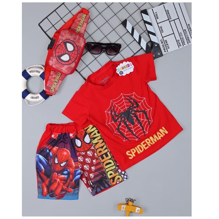 Đồ bộ thun bé trai hình siêu nhân thiết kế áo cổ tròn, tay ngắn, viền tay và viền cổ được trang trí khác màu. Thân trước in họa tiết hình nhện . Quần được may lưng thun thoải mái cho bé vận động, sử dụng gam màu đỏ xanh đặc trưng của người nhện tạo sự nổi bật cho toàn bộ sản phẩm. Hình in sắc nét, không bong tróc.