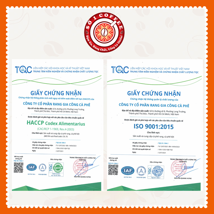 1. Nhà máy rang xay cà phê chuẩn ISO & HACCP, chuẩn ATVSTP bảo vệ sức khỏe cho người dùng
