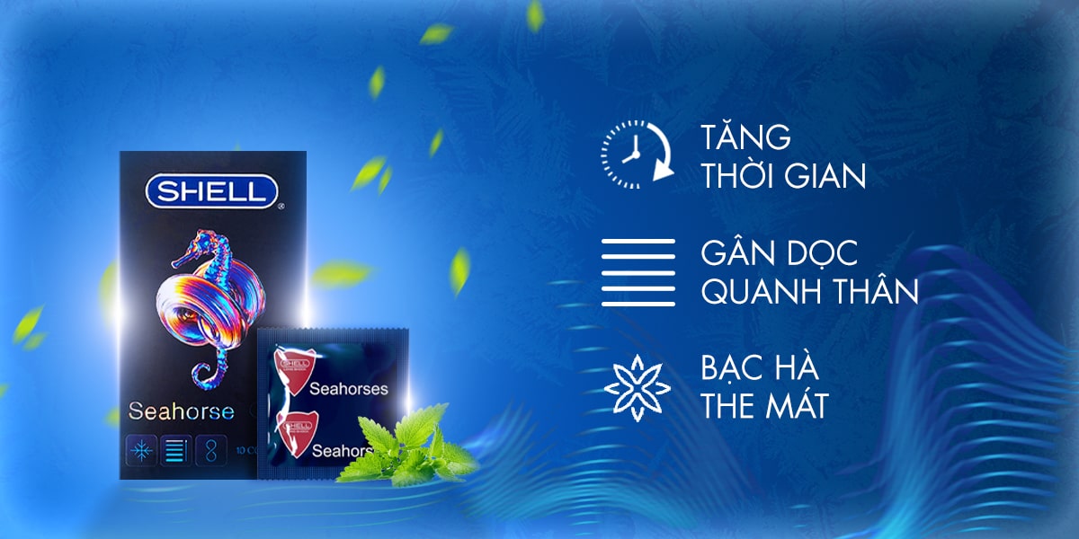 ✪ Thông tin: Shell Seahorse là sản phẩm bao cao su kết hợp đa tính năng đến từ Hàn Quốc, nhằm đem lại cho bạn những trải nghiệm tuyệt vời khi quan hệ. Đúng như tên gọi, sản phẩm Shell Seahorse đột phá với tinh chất bạc hà siêu mát lạnh đem đến cảm giác mới lạ giúp thổi bùng cảm hứng cho các cặp đôi và kéo dài thời gian quan hệ lên gấp 2-3 lần đồng thời lấn át đi những mùi khó chịu khi quan hệ.