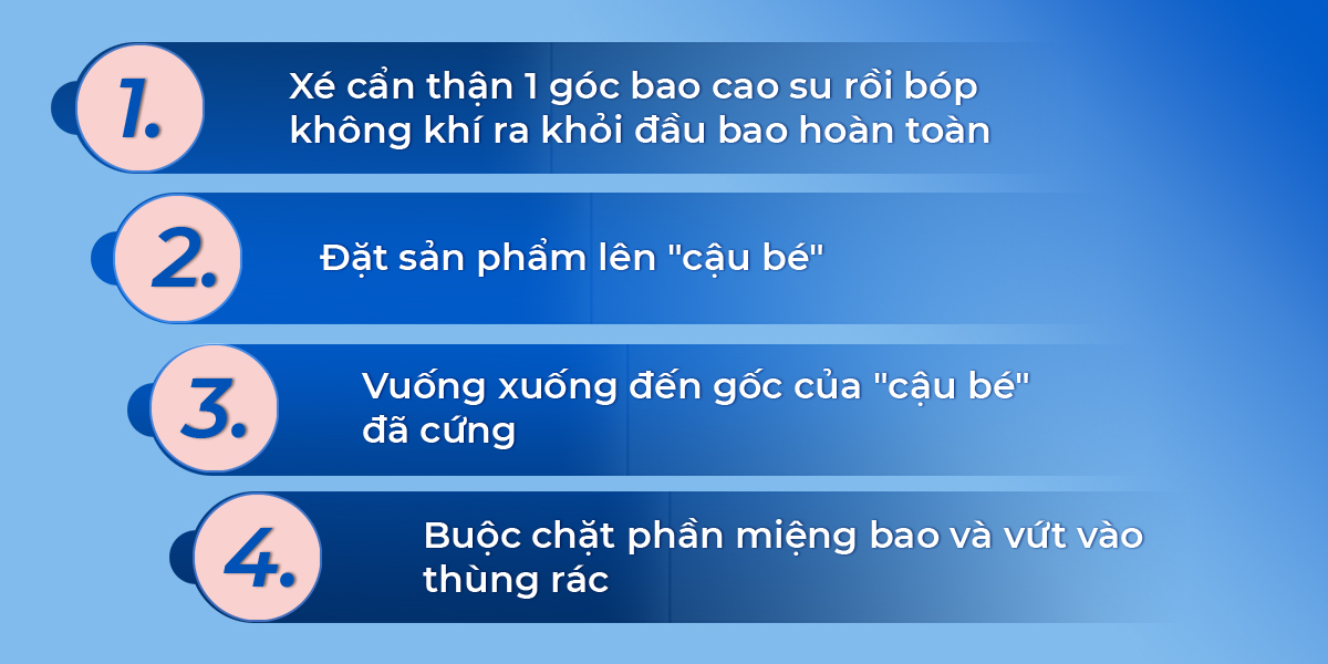 ✪ Cách dùng: Cẩn thận xé 1 góc bao cao su rồi bóp không khí ra khỏi đầu bao, sau đó đặt bao vào đầu rồi vuốt xuống đến gốc. Sau khi quan hệ xong giữ đầu bao rồi từ từ rút ra tránh làm tràn tinh dịch. Thắt miệng bao rồi vứt vào thùng rác.