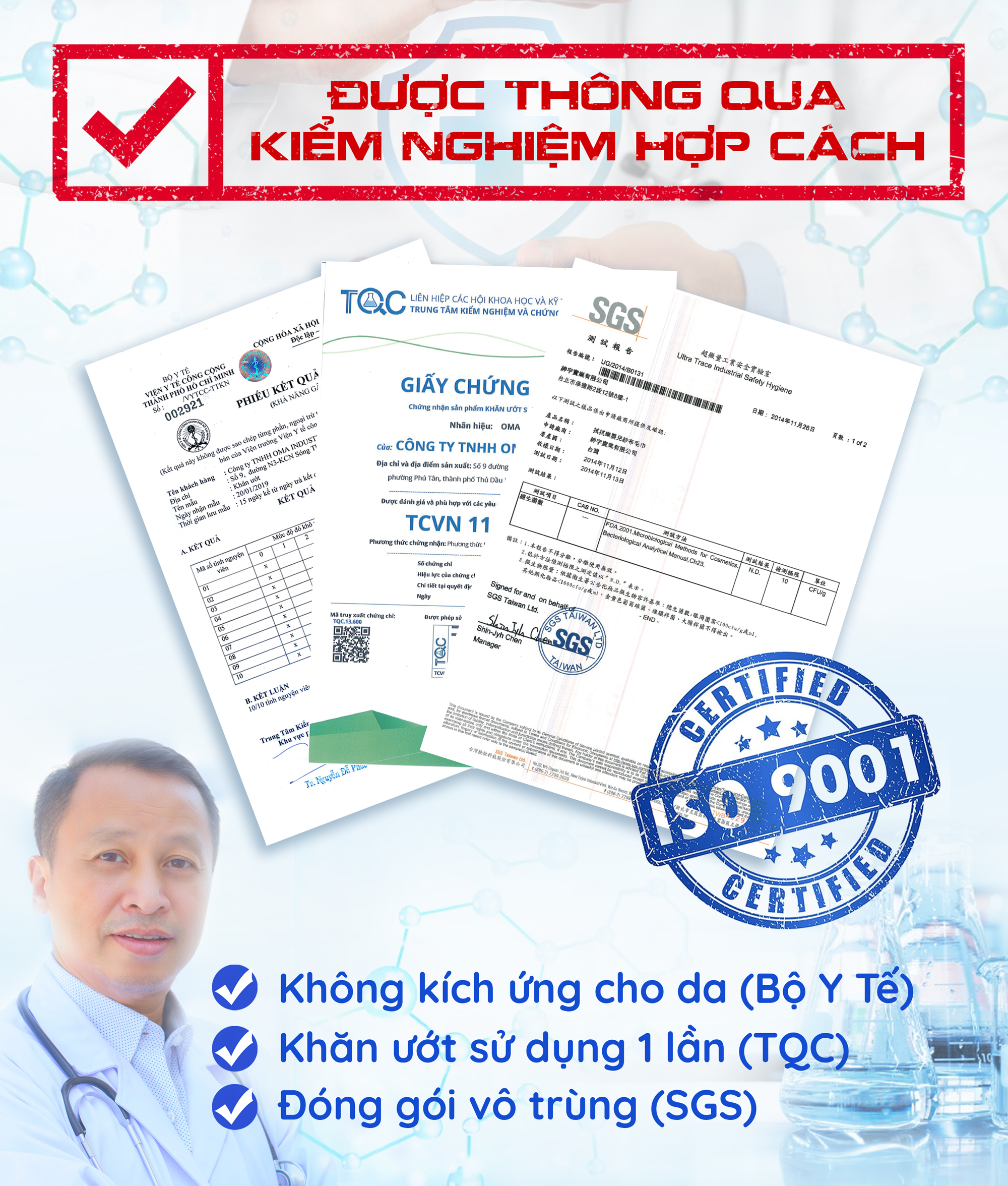 3, Khăn ướt Oma Baby Đạt chứng nhận chất lượng ISO 9001, TCVN kiểm soát nghiêm ngặt chất lượng trong suốt quá trình sản xuất, đảm bảo an toàn cho người tiêu dùng.