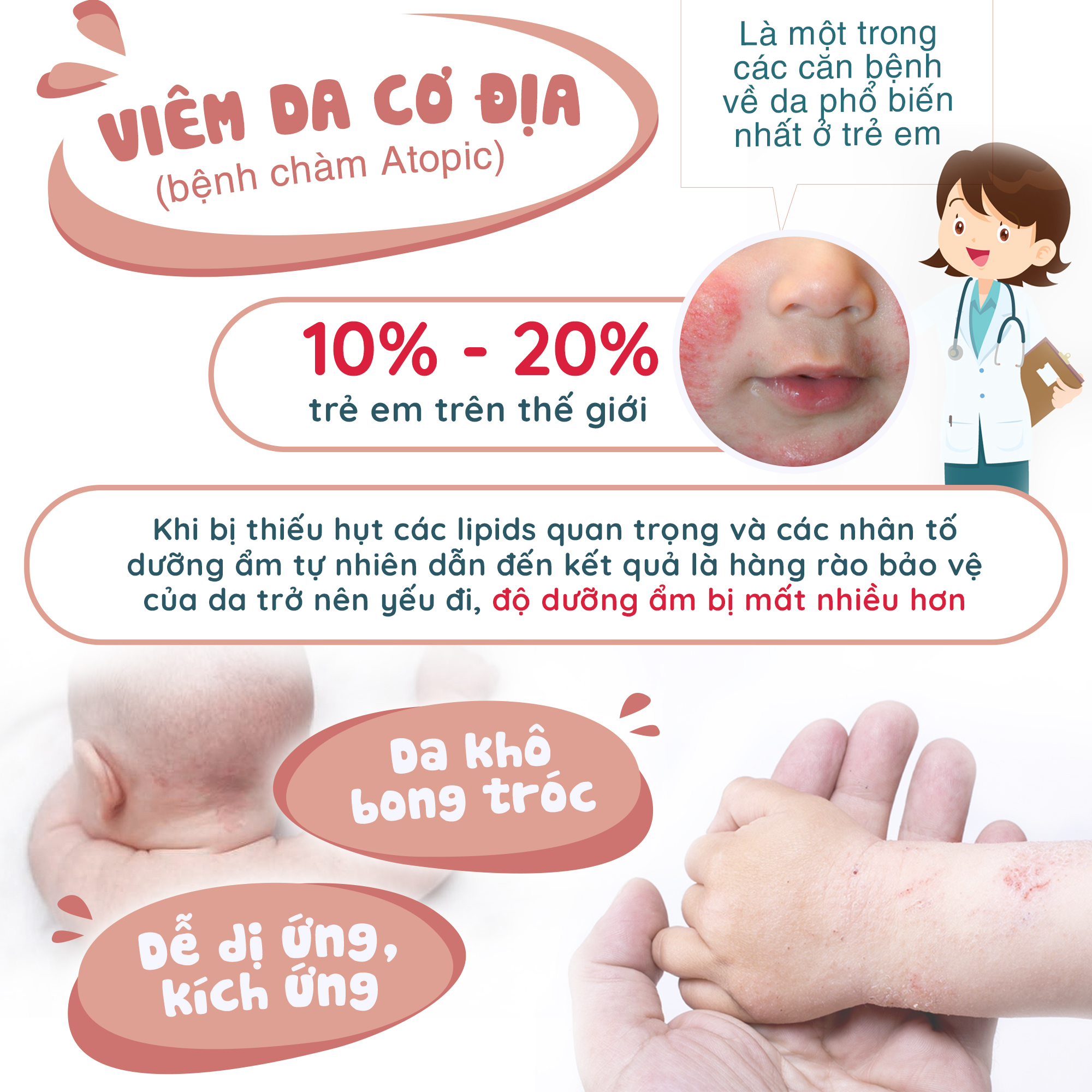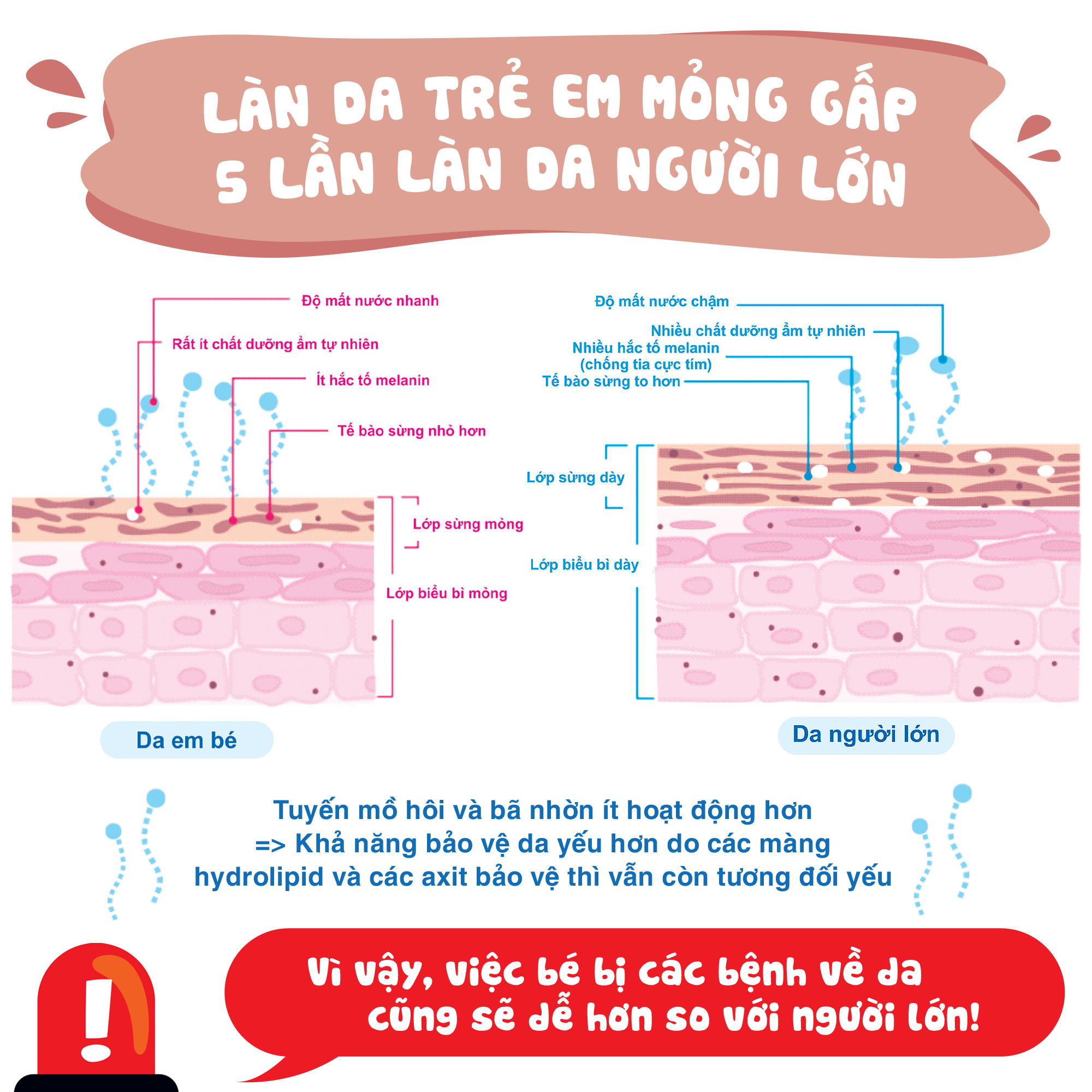 1, Bạn có biết: Làn da trẻ em mỏng gấp 5 lần làn da người lớn, Lớp da ngoài cùng của biểu bì (lớp sừng): mỏng hơn, tế bào được sắp xếp ít chặt chẽ hơn. Tuyến mồ hôi và bã nhờn: ít hoạt động hơn -> khả năng bảo vệ da yếu hơn do các màng hydrolipid và các axit bảo vệ thì vẫn còn tương đối yếu
