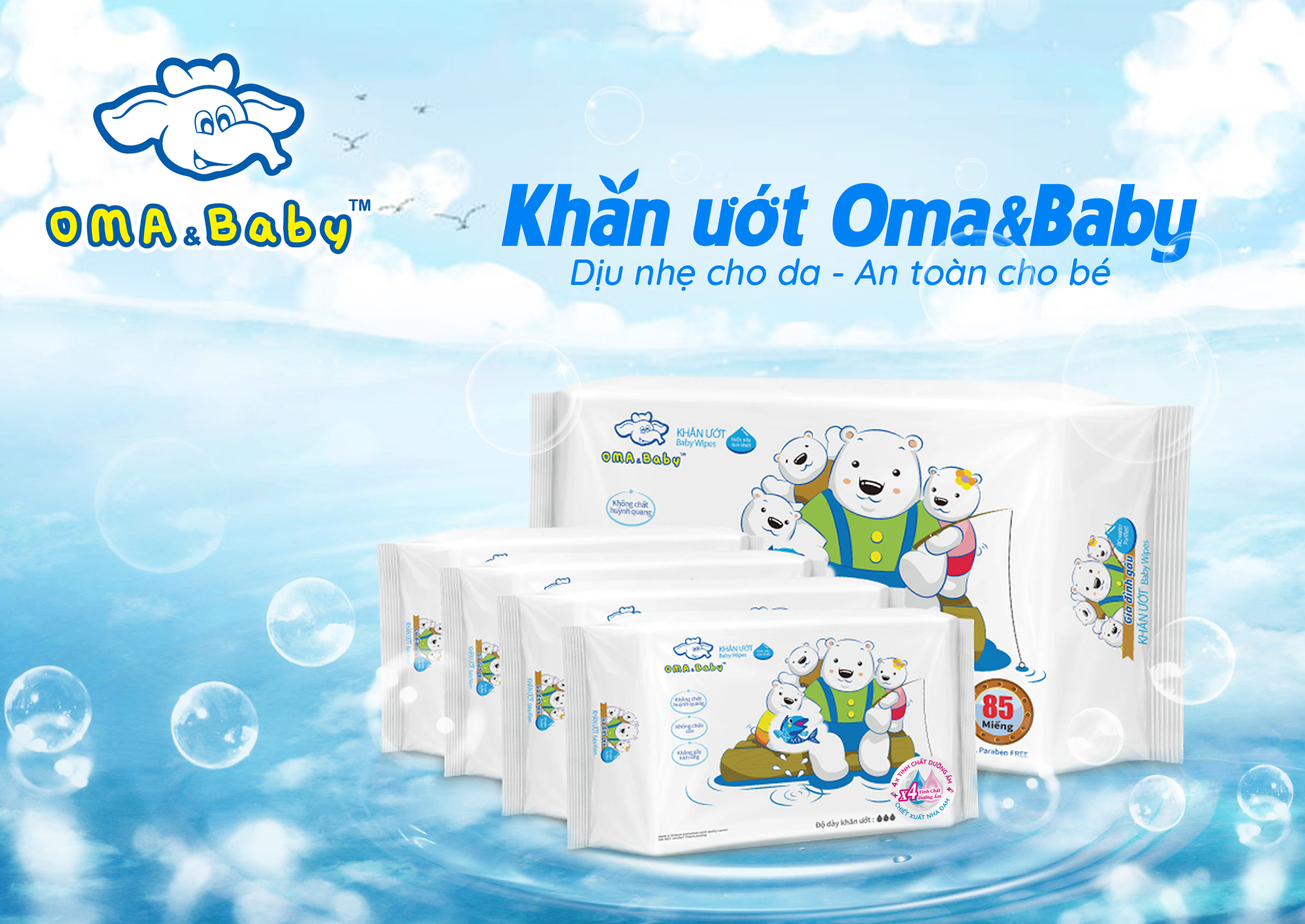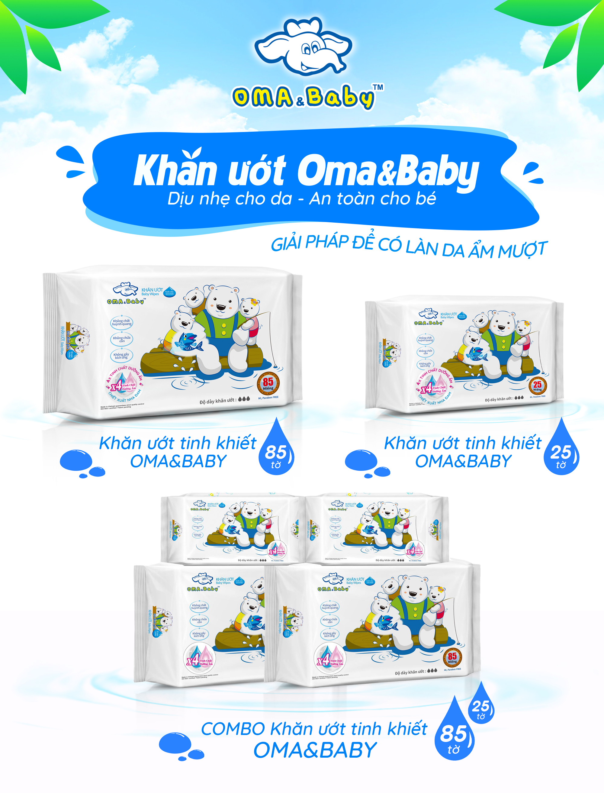 Combo 6+4 khăn ướt làm sạch tinh khiết dành cho bé Oma&Baby với công thức chlorhexidine DIgluconate kháng khuẩn an toàn dịu nhẹ (6 gói 85pcs+4 gói 25pcs)
