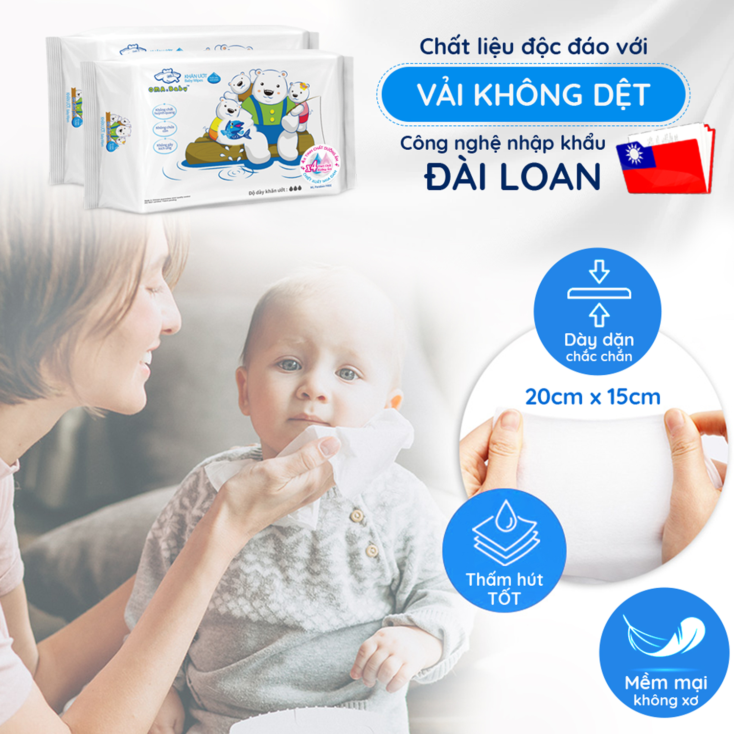 - Vải không dệt chất lượng cao, mềm mại không xơ, thấm hút tốt