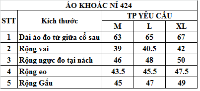 THÔNG SỐ ÁO KHOÁC NỈ |