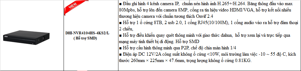 | ■ Đầu ghi hình 4 kênh camera IP, chuẩn nén hình ảnh H.265+/H.264. Băng thông đầu vào max 80Mpbs, hỗ trợ lên đến camera 8MP, cổng ra tín hiệu video HDMI/VGA, hỗ trợ kết nối nhiều thương hiệu camera với chuẩn tương thích Onvif 2.4 ■ Hỗ trợ 1 ổ cứng 8TB, 2 usb 2.0, 1 cổng RJ45(10/100M), 1 cổng audio vào ra hỗ trợ đàm thoại 2 chiều, ■ Hỗ trợ điều khiển quay quét thông minh với giao thức dahua, hỗ trợ xem lại và trực tiếp qua mạng máy tính thiết bị di động. Hỗ trợ SMD ■ Hỗ trợ cấu hình thông minh qua P2P, chế độ chia màn hình 1/4 ■ Điện áp DC 12V/2A công suất không ổ cứng <10W, môi trường làm việc -10 ~ 55 độ C, kích thước 260mm × 225mm × 47.6mm, trọng lượng không ổ cứng 0.81KG.