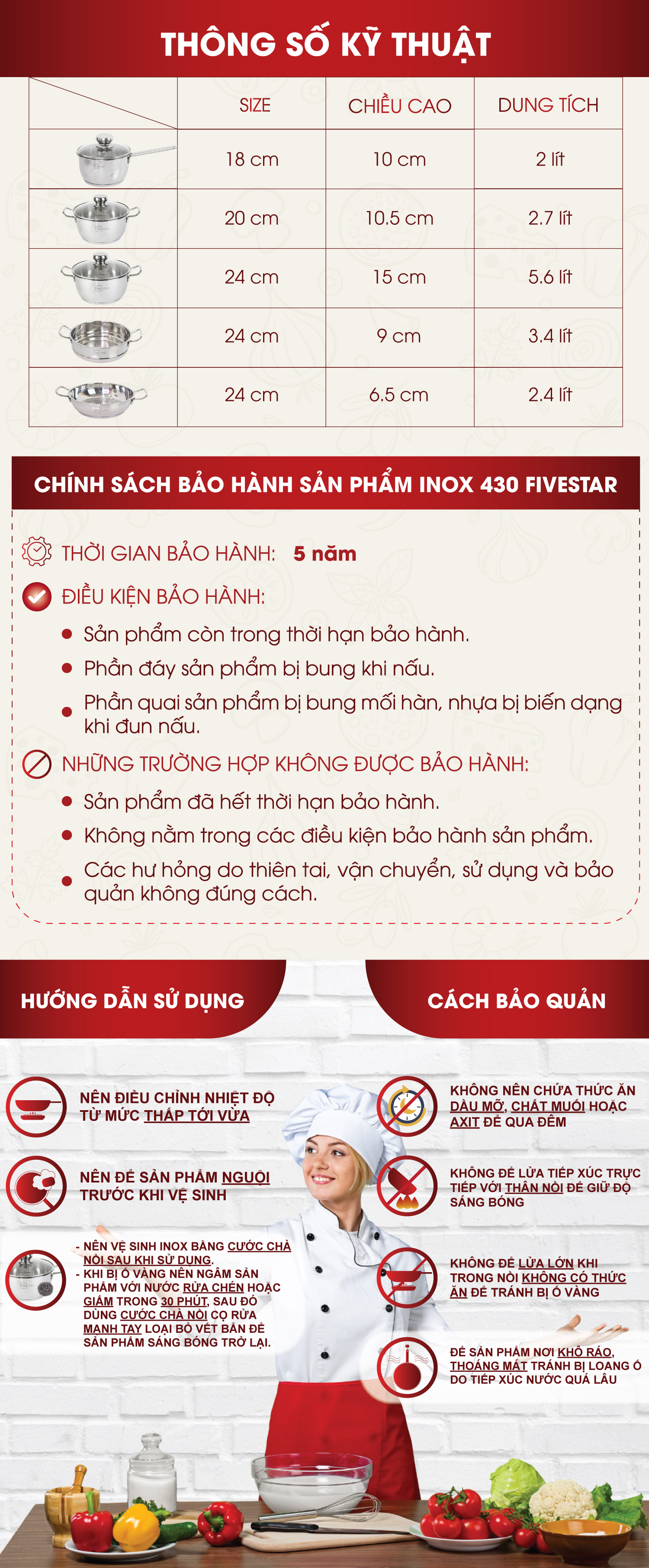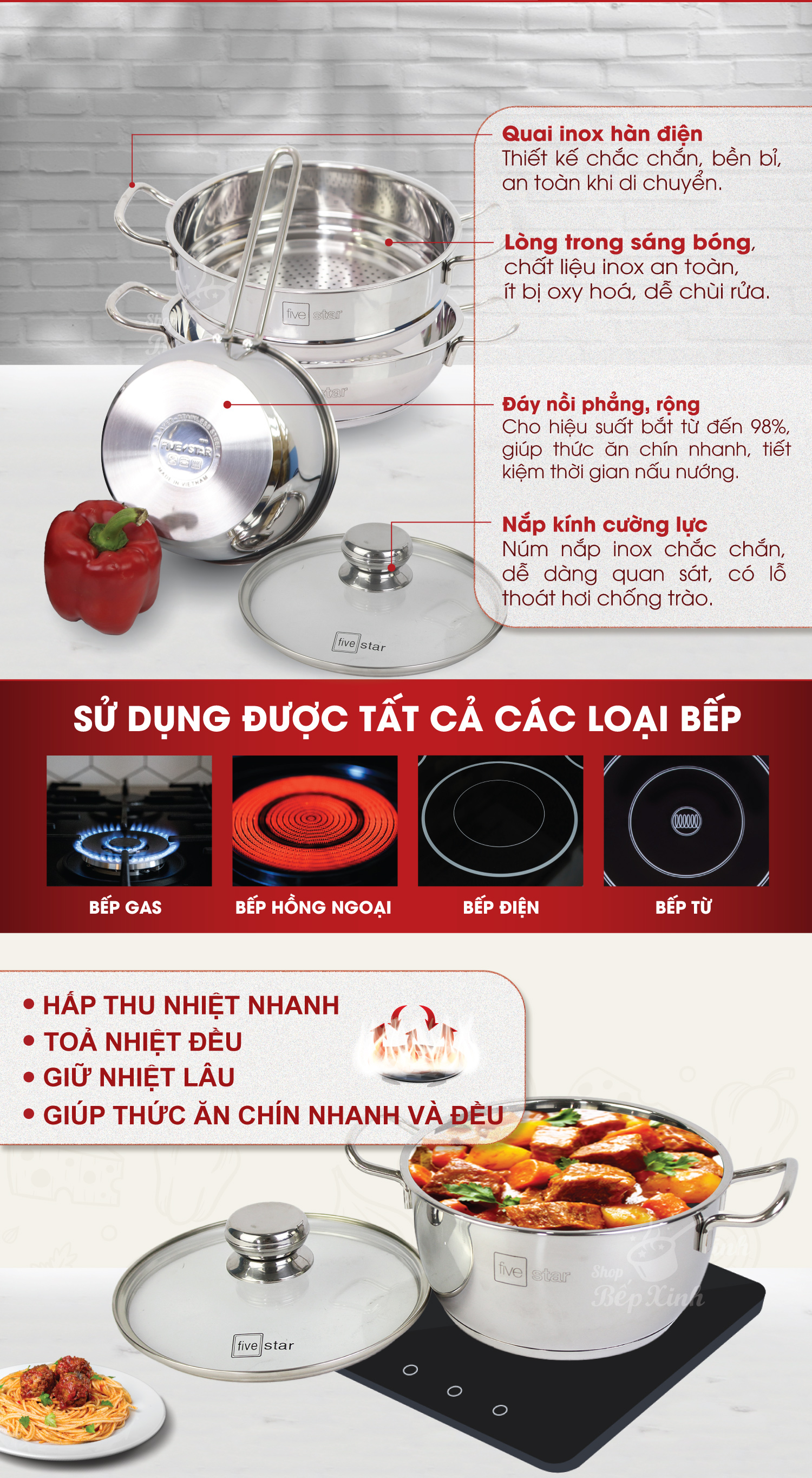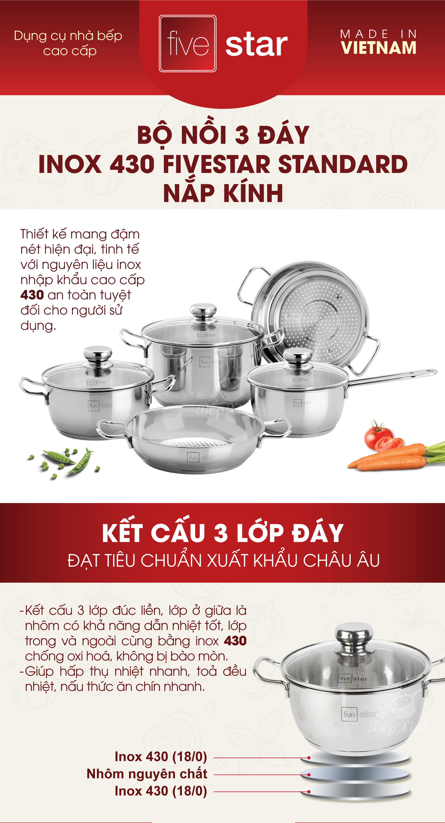 Giới thiệu Bộ Nồi Chảo 3 Đáy Inox 430 Cao Cấp Fivestar Standard 6 món nắp kính , tặng 5 muỗng ăn