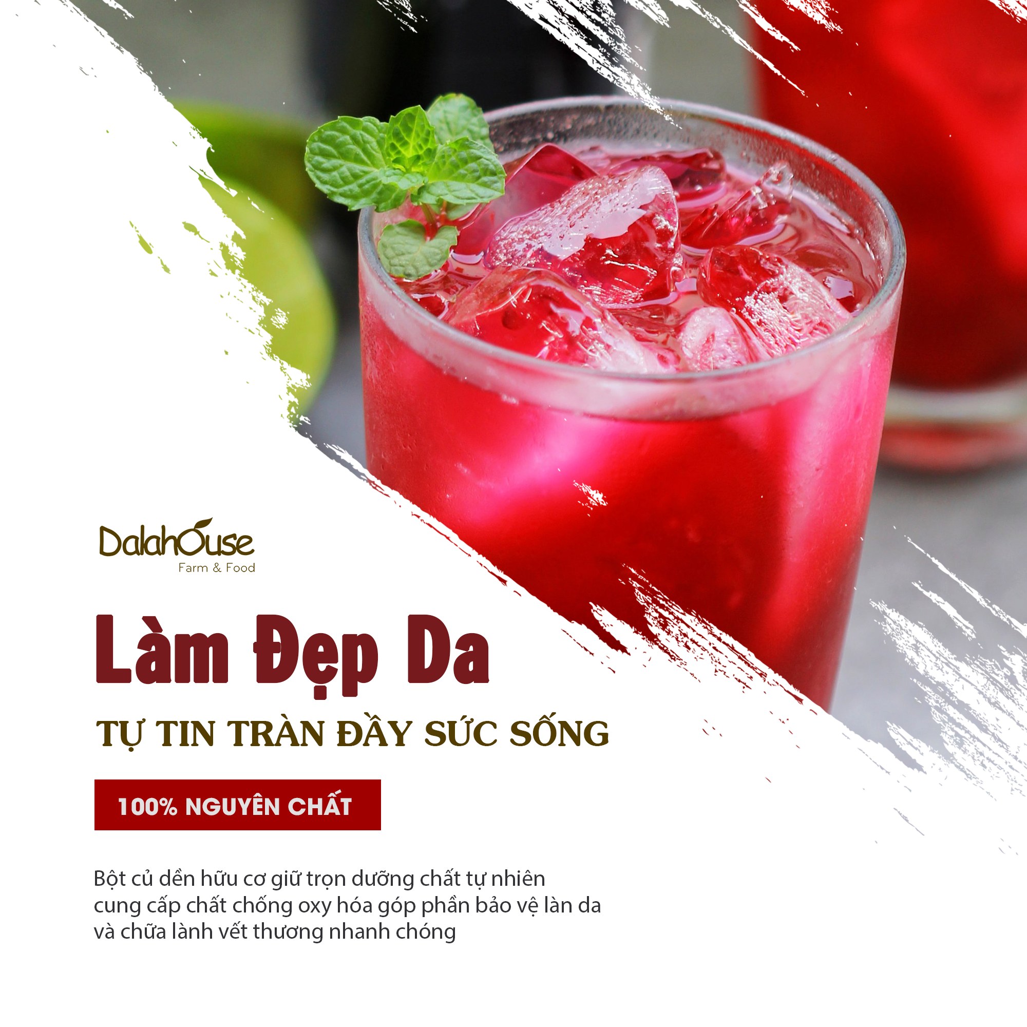 - Sản phẩm nguyên chất 100% từ củ dền tươi, không chất bảo quản, không chất phụ gia. Sản phẩm tan trong nước rất tiện lợi khi sử dụng.