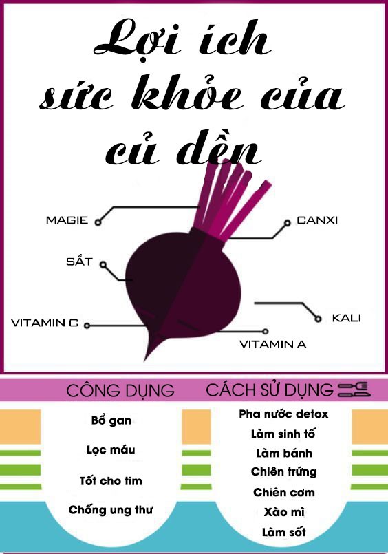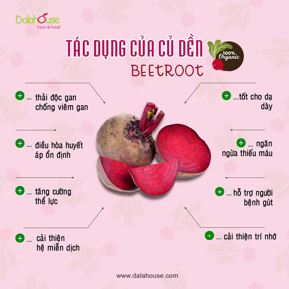 - Bột củ dền còn là thực phẩm bổ dưỡng cho người cao tuổi, có tác dụng trong việc bảo vệ sức khỏe như thanh lọc cơ thể, bảo vệ gan, ngăn ngừa bệnh ung thư, chống thiếu máu, cân bằng huyết áp, chữa bệnh gout, có tác dụng trong hỗ_trợ_điều_trị xơ vữa động mạch. Các vitamin và các chất dinh dưỡng trong củ dền giúp tăng cường hệ miễn dịch và chống nhiễm trùng, giúp kích thích sự oxy hóa của các tế bào, sản sinh ra những tế bào máu mới.