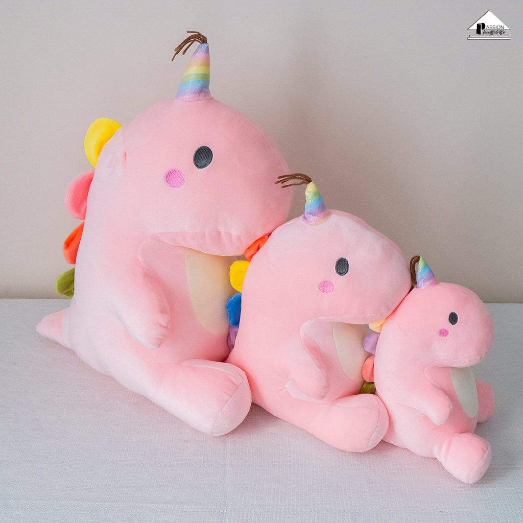 Gấu Bông mới toanh của là sự kết hợp giữa dáng hình của chú khủng long to lớn cùng sắc màu nổi bật trên thần thú ngựa sừng (Unicorn). Gấu Bông Búp Bê Khủng Long Ngồi Tua Rua sở hữu diện mạo cưng xỉu với ba sắc màu Pastel ngọt lịm: Xanh lá, Hồng và Xanh biển.
