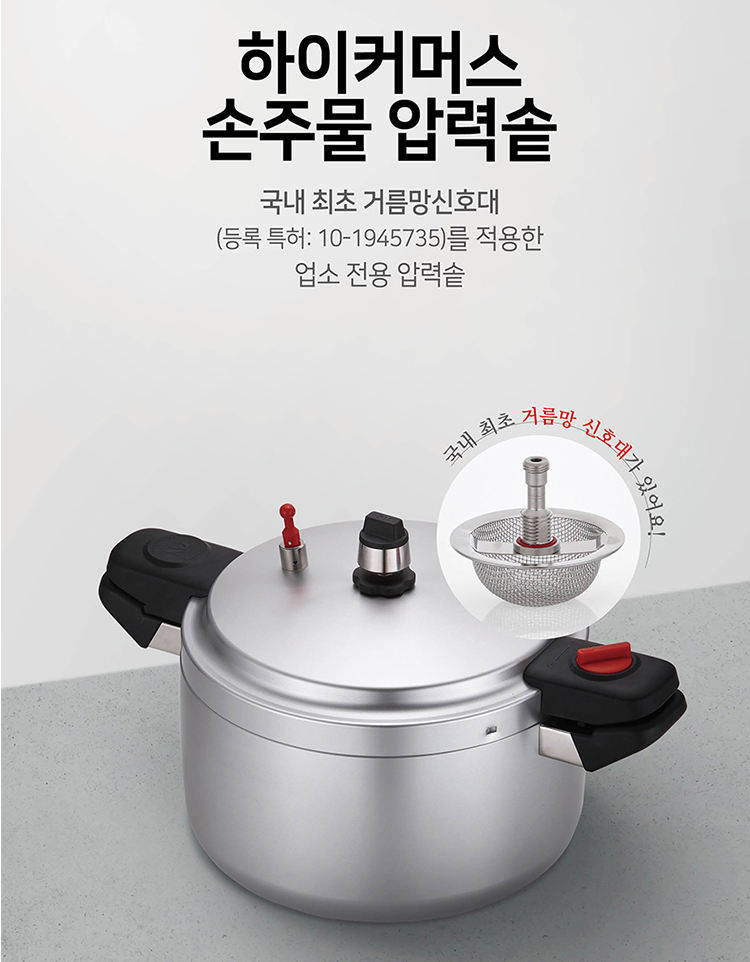 Nồi áp suất nhôm chống dính cao cấp hiệu PoongNyun HCAPC-20 Series Highcommerce GravityCasting được làm từ nhôm tinh khiết nguyên khối dầy 5.0mm với kỹ thuật đúc trọng lực nguyên khối “Gravity Casting” và công nghệ tráng men hiện đại nhất “Soft Anodizing” không tróc men, chống gỉ sét, chống ăn mòn, chống dính giữ và gia nhiệt nhanh hơn giúp thức ăn chín mềm cực nhanh, tiết kiệm thời gian và nhiên liệu với các món hầm, luộc, kho, hấp, nấu cháo, nấu cơm, nấu cơm trộn, nấu gạo lức…., dùng trên bếp gas, bếp điện và bếp hồng ngoại, tay cầm ngắn và chống nóng, chức năng khóa an toàn tự động 5 chế độ, có ghim Inox vệ sinh nút tín hiệu kèm theo sản phẩm thuận tiện sử dụng cho gia đình và nhà hàng, màu bạc tay cầm đen.