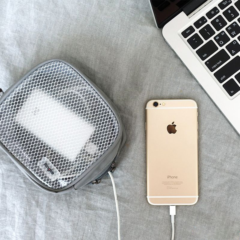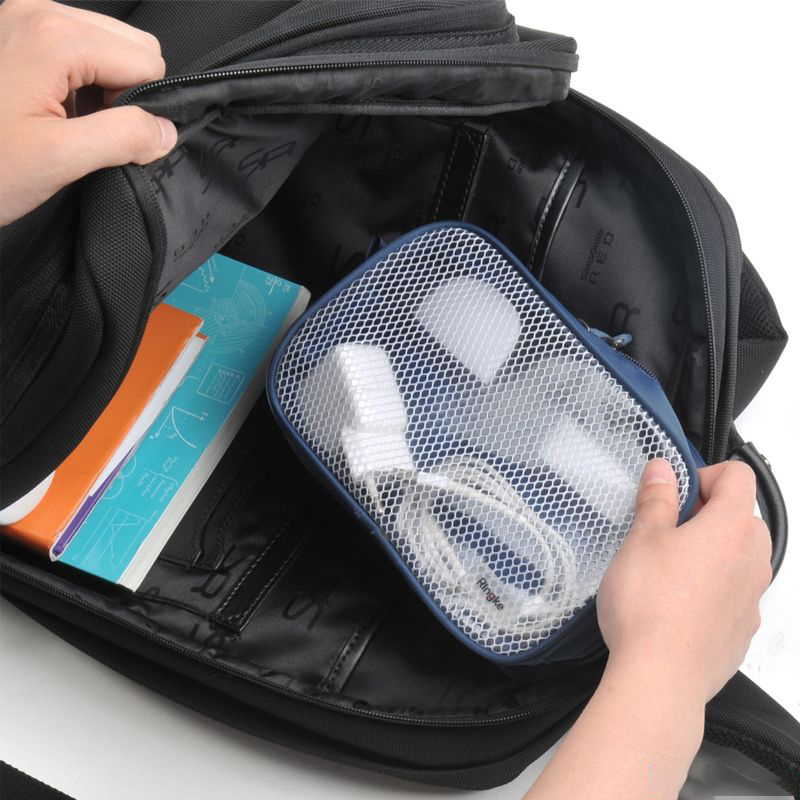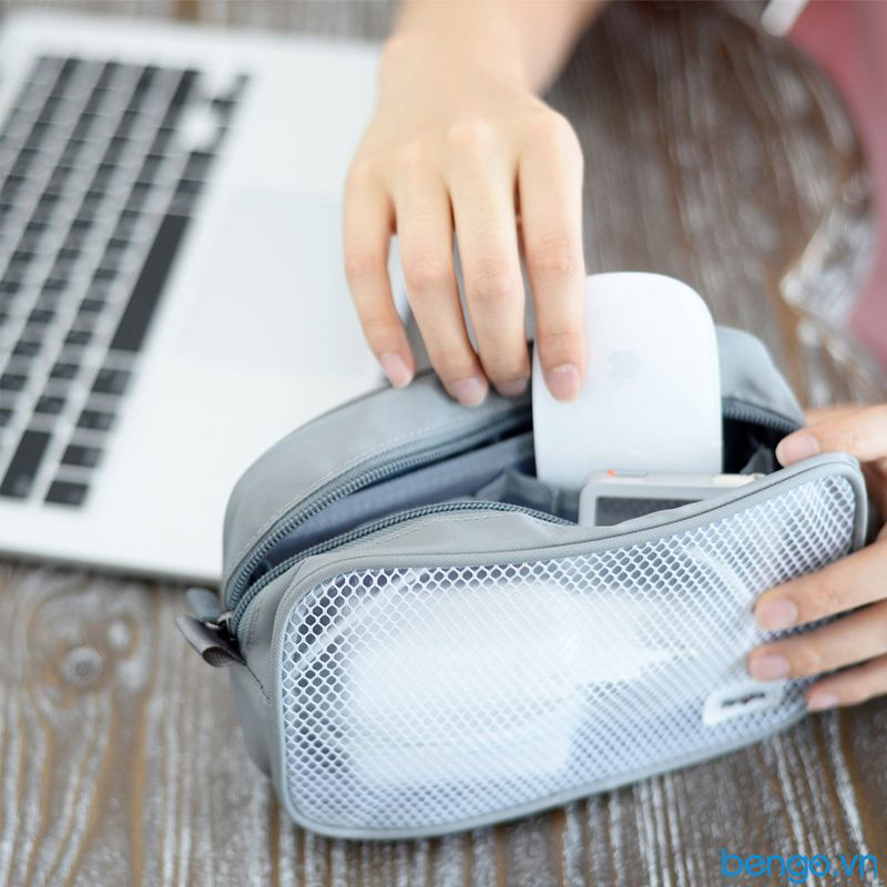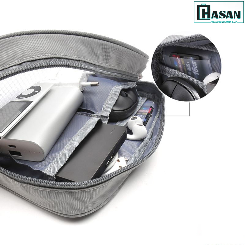 - Ngăn chính lớn có mặt trước trong suốt, bên trong có túi nhỏ màu trắng chống nước dành để dựng thẻ nhớ, USB, danh thiếp, 2 túi nhỏ phía trước có miệng túi co giãn giúp giữ các thiết bị không bị rơi ra ngoài như tai nghe, dây sạc, hộ chiếu,ếp theo là 2 túi rộng hơn dùng để chuột, pin sạc dự phòng, điện thoại, ví, adapter, Không gian trống còn lại bạn có thể đựng mĩ phẩm size mini, chìa khóa, sổ tay, pin sạc dự phòng, giúp cho việc lấy ra/cất vào nhanh chóng.