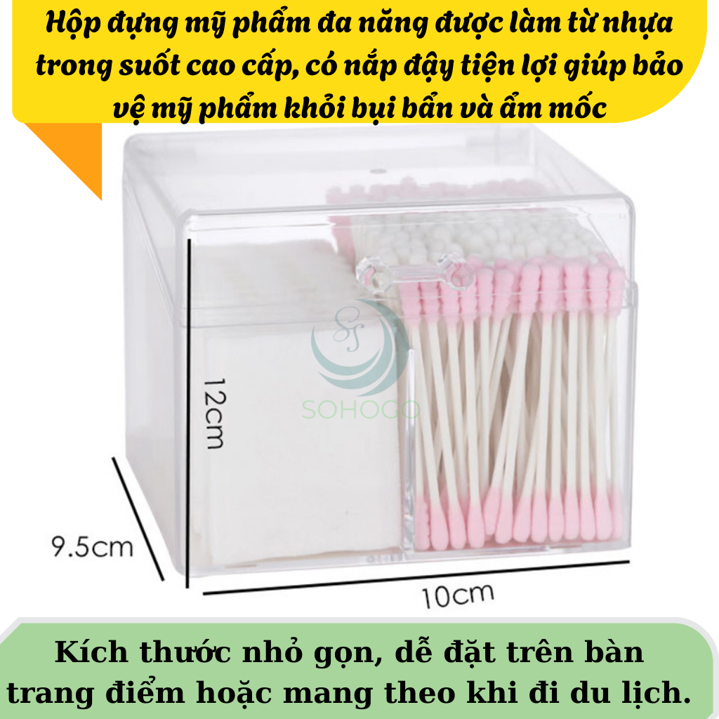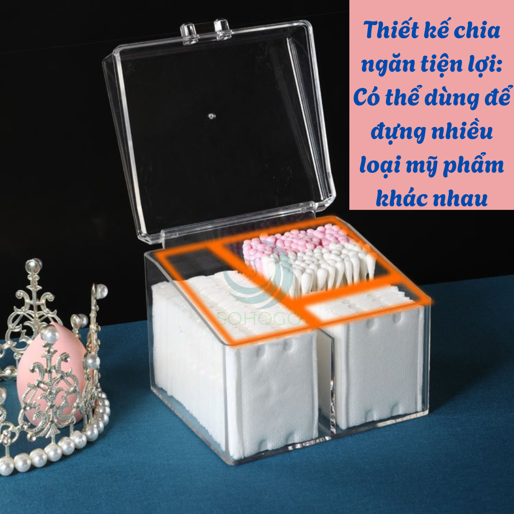 Hộp đựng mỹ phẩm đa năng được làm từ nhựa trong suốt cao cấp, có nắp đậy tiện lợi giúp bảo vệ mỹ phẩm khỏi bụi bẩn và ẩm mốc. Thiết kế thông minh với các ngăn chia riêng biệt cho phép bạn dễ dàng sắp xếp và bảo quản nhiều loại mỹ phẩm như son môi, mút trang điểm, bông tẩy trang... Hộp nhỏ gọn, dễ đặt trên bàn trang điểm hoặc mang theo khi đi du lịch.