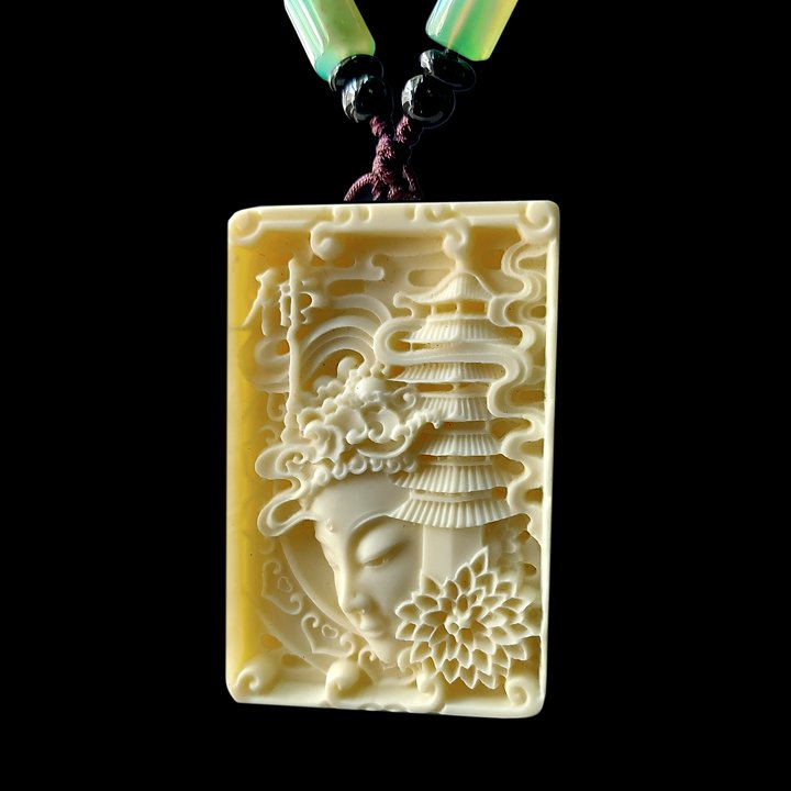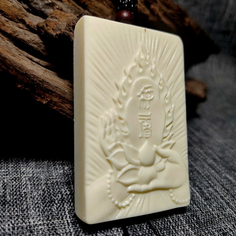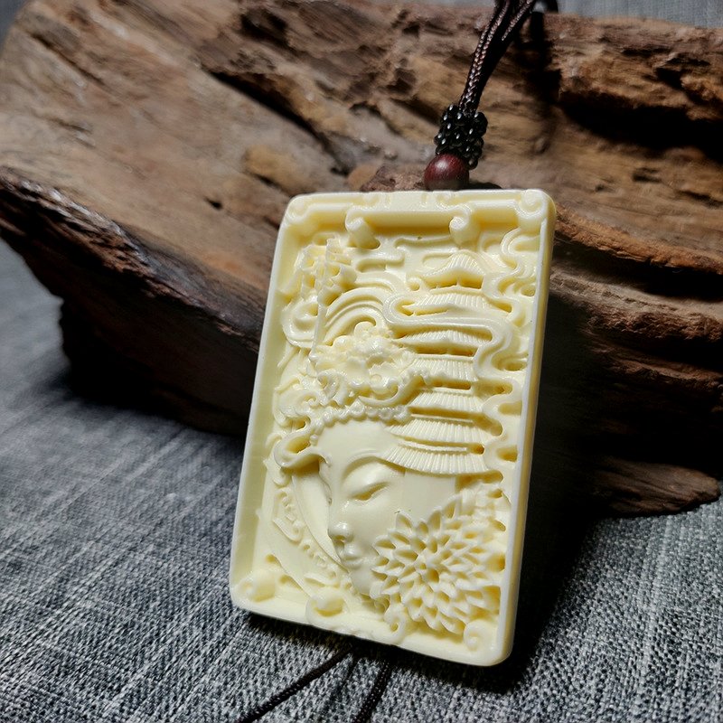 Dây chuyền, mặt dây chuyền hình thẻ khắc biểu tượng tháp chấn yêu bằng quả ngà (trái dừa ngà -màu trắng ngà) - MN01