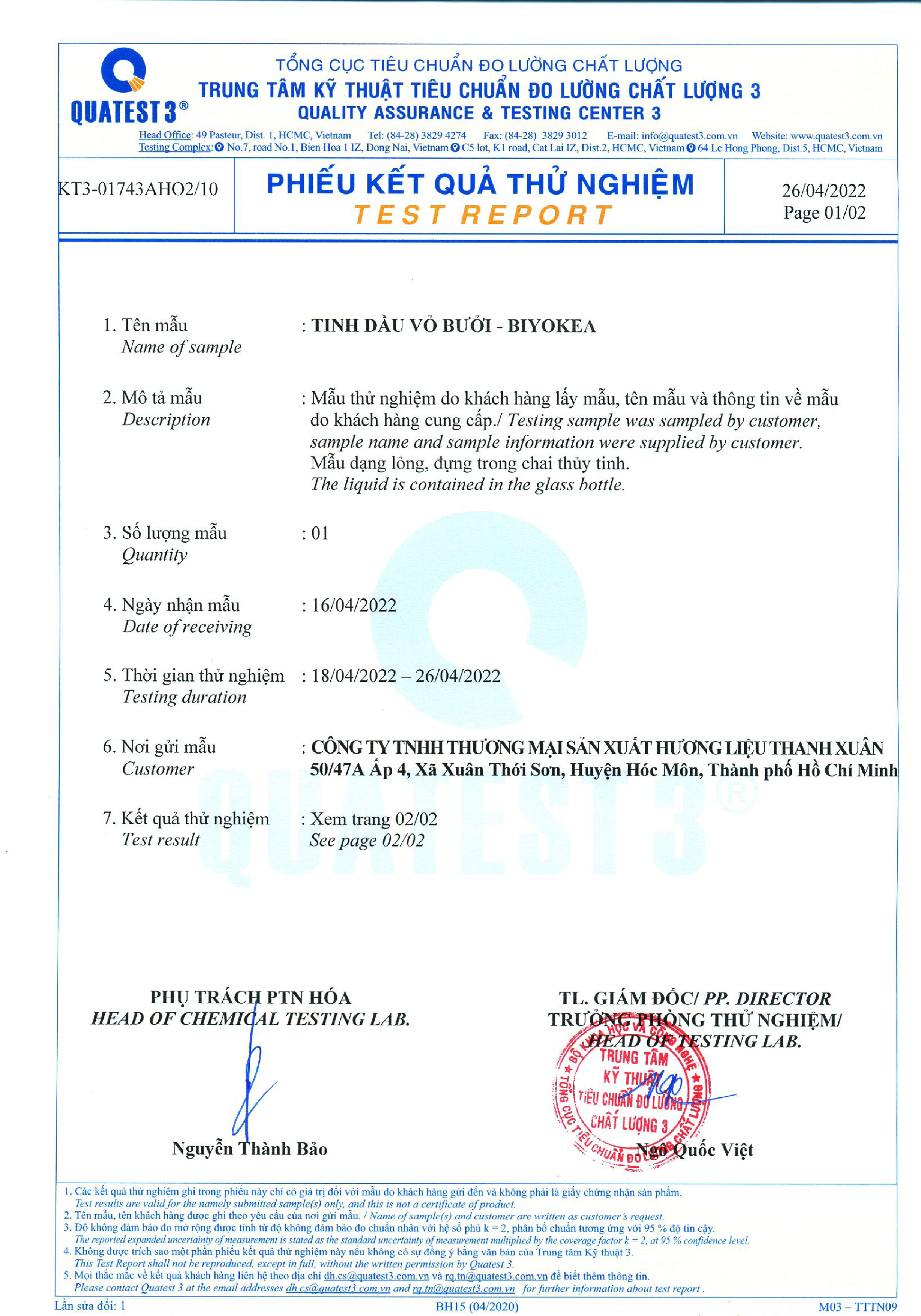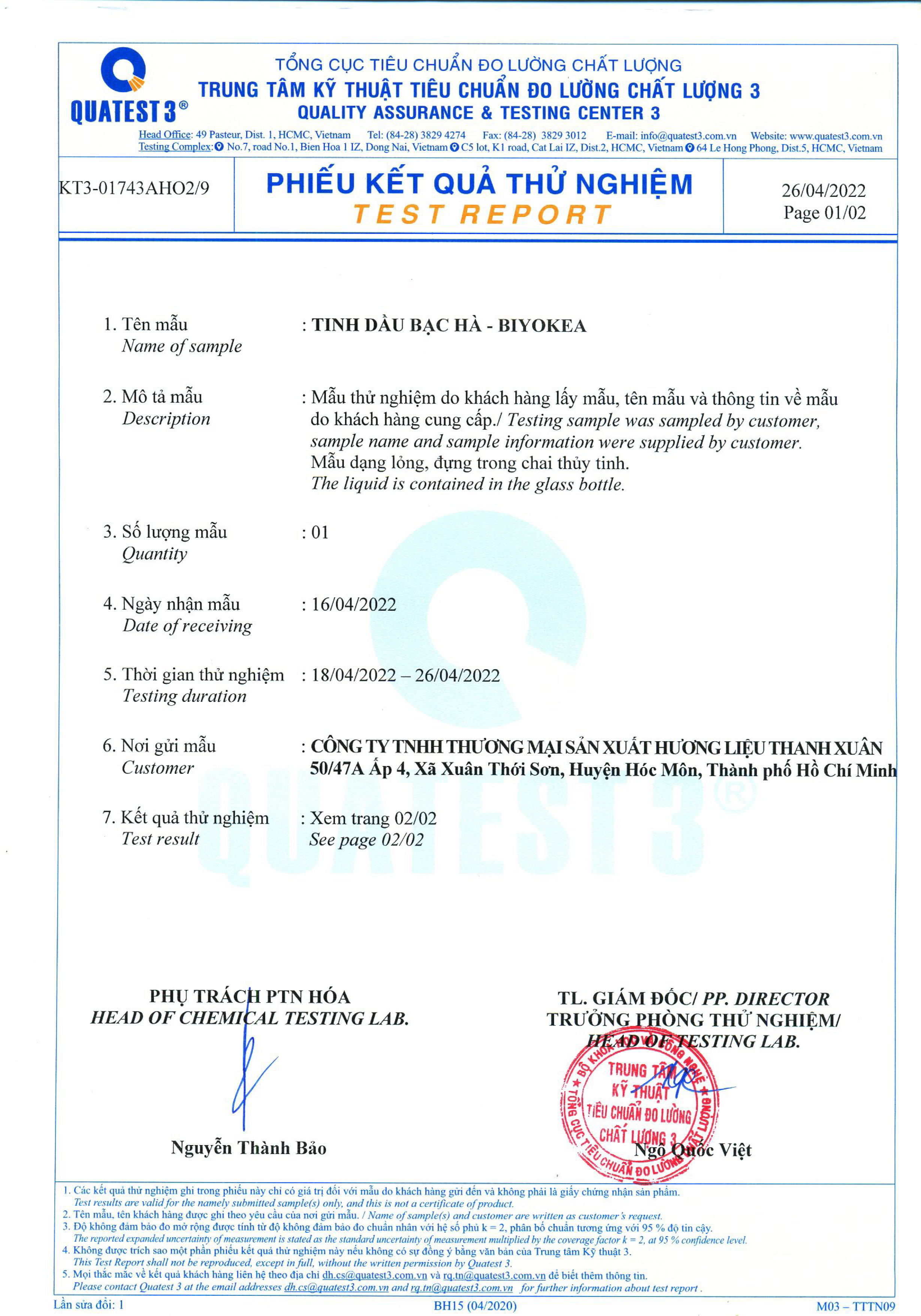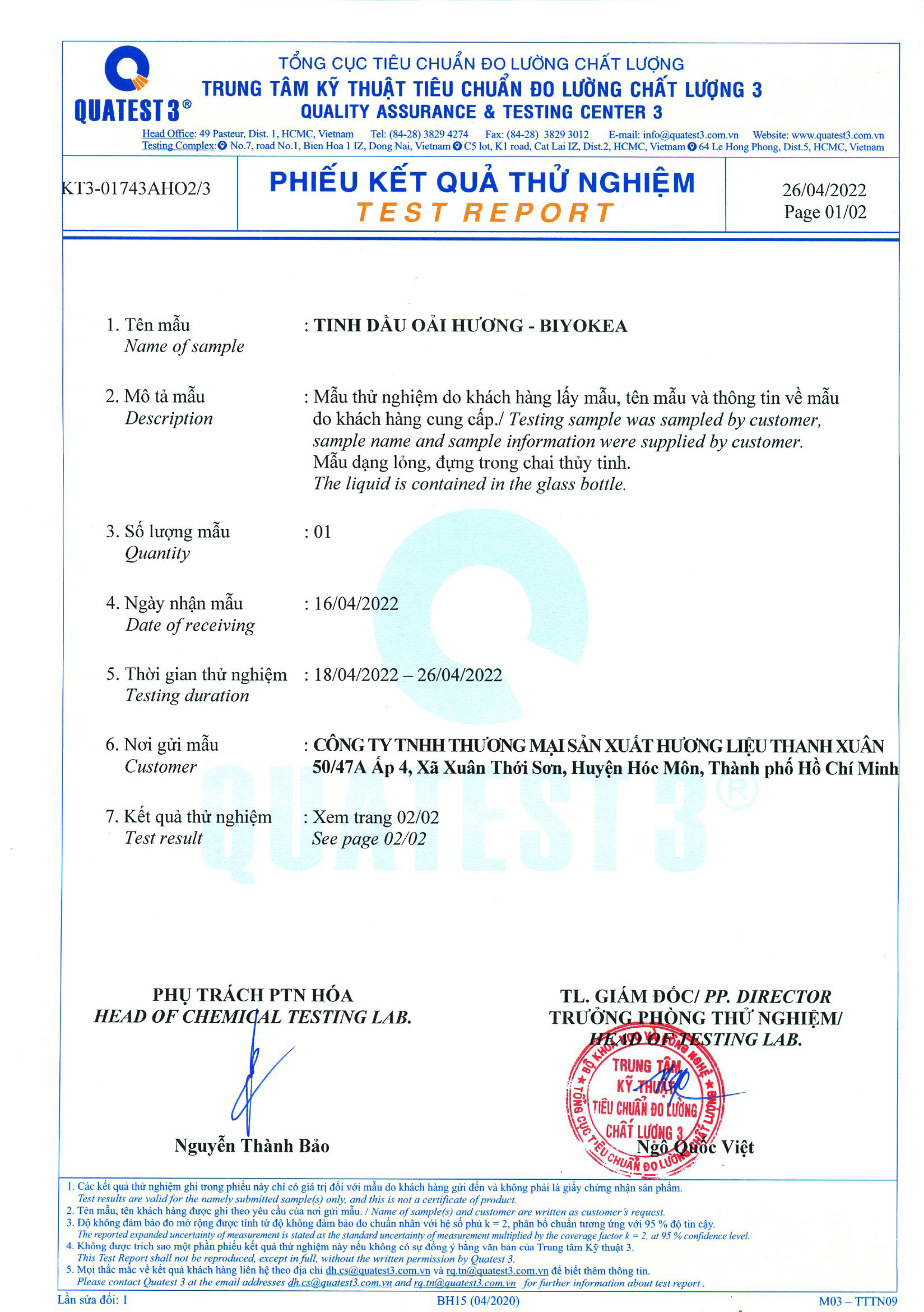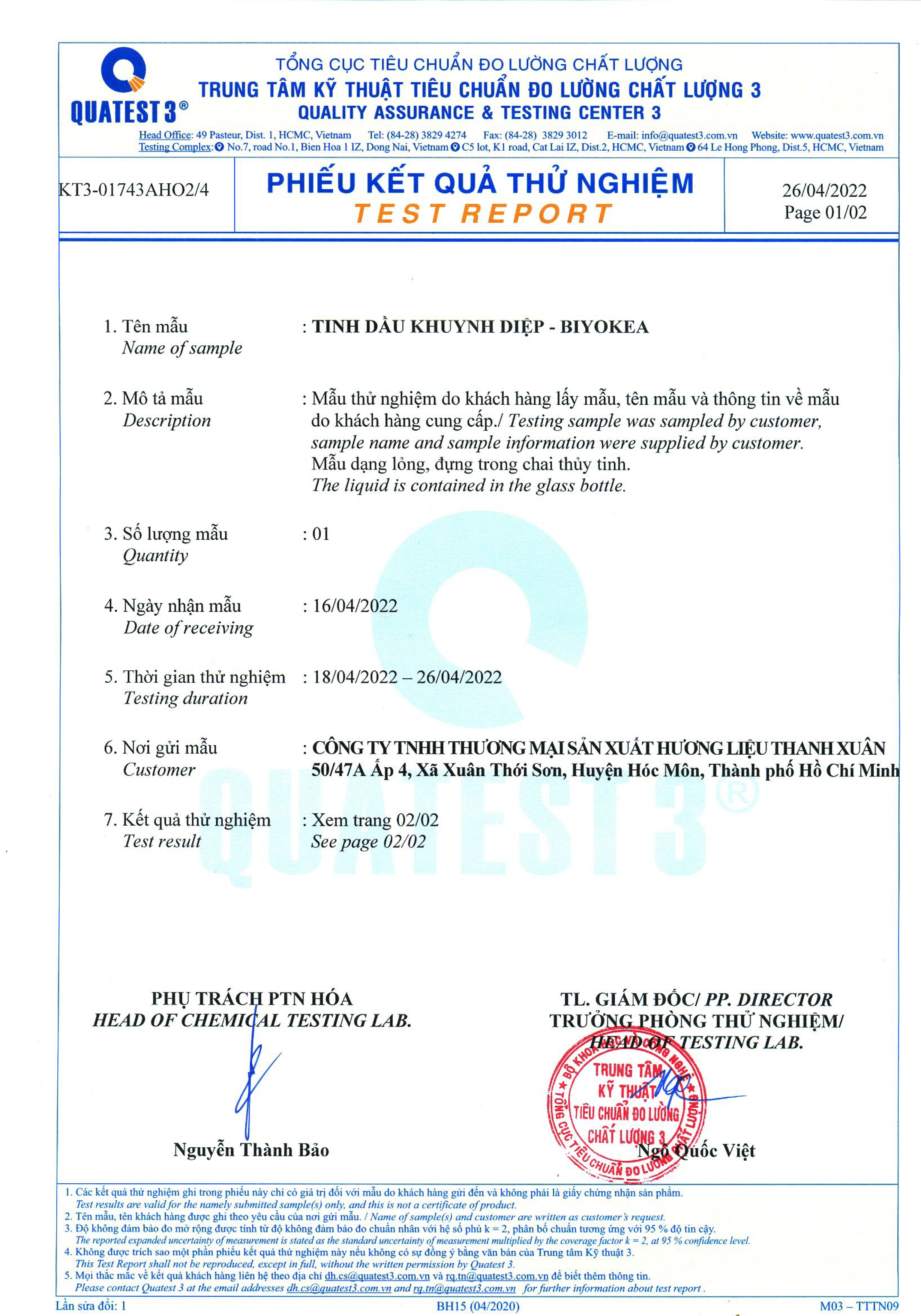 Các sản phẩm tinh dầu BIYOKEA luôn được kiểm nghiệm chất lượng đầy đủ trước khi lưu hành ra thị trường, vừa giúp chúng tôi kiểm soát chất lượng sản phẩm và vì sức khỏe của khách hàng.