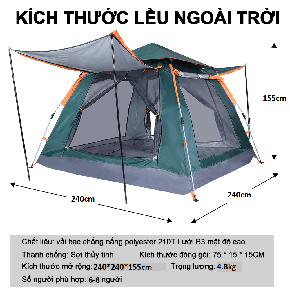- Kích Thước (6-8 người): 240cm x 240cm x 155cm