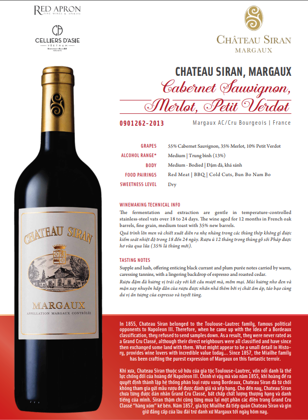 Giới thiệu Rượu vang đỏ Pháp Chateau Siran Margaux 2013