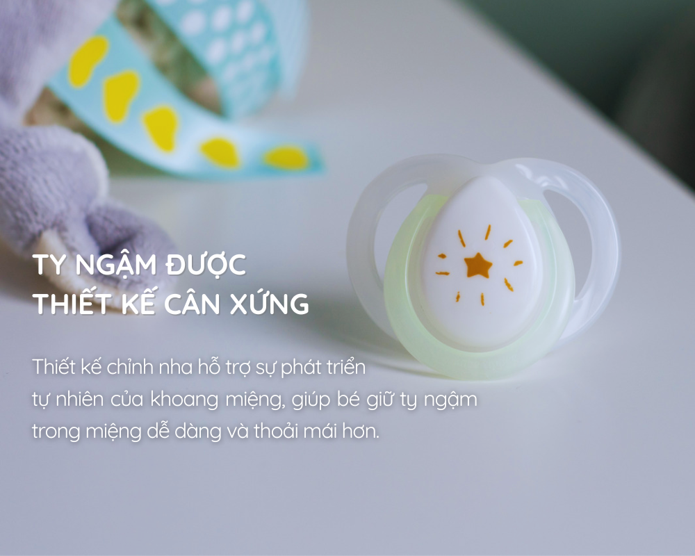 - Ty ngậm chỉnh nha: Phần núm ty ngậm được thiết kế cân xứng để tăng tính cân bằng, hỗ trợ sự phát triển khoang miệng tự nhiên của bé.