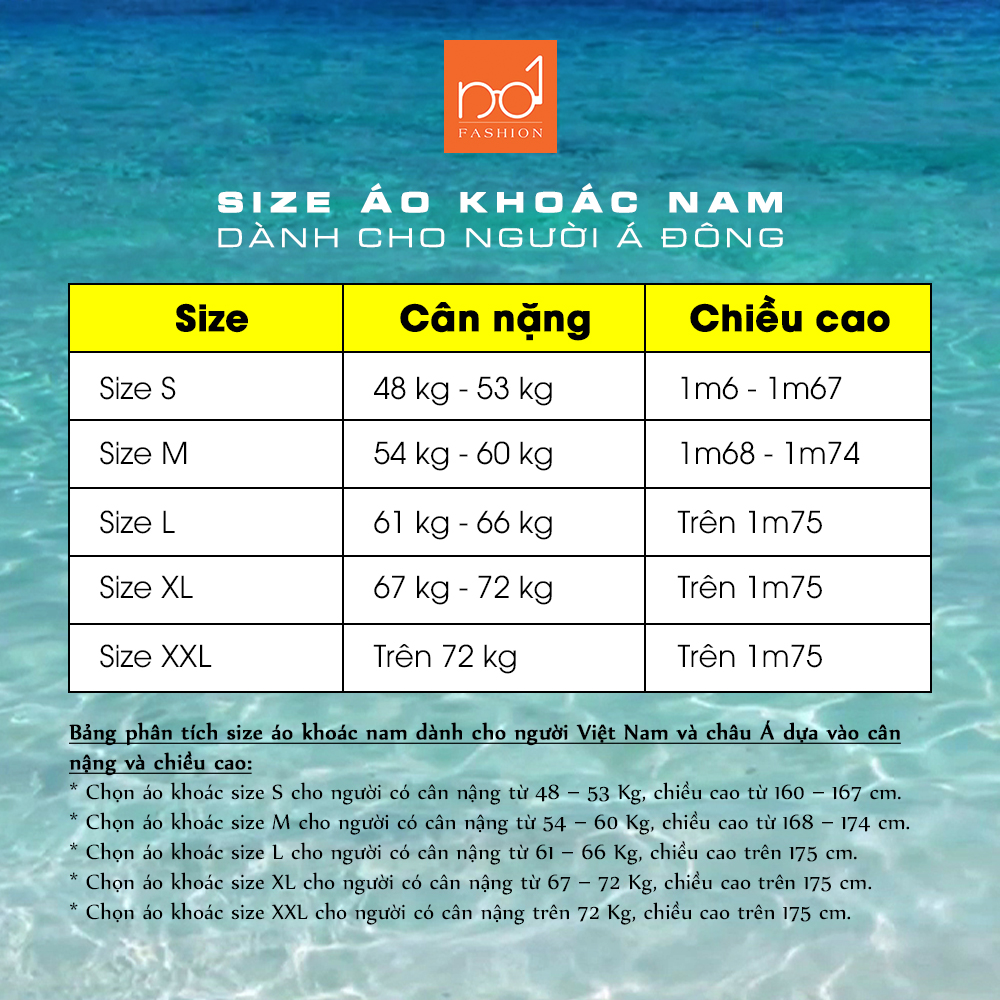 * Chọn áo khoác size S cho người có cân nặng từ 48 – 53 Kg, chiều cao từ 160 – 167 cm.