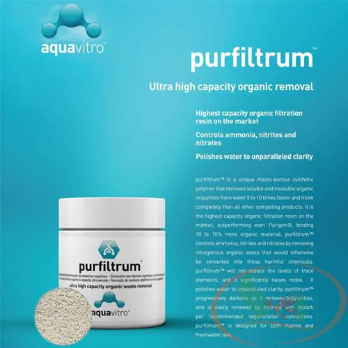 Vật liệu lọc Aquavitro Purfiltrum là một dạng polyme tổng hợp xốp vĩ mô độc đáo giúp loại bỏ các tạp chất hữu cơ hòa tan và không hòa tan khỏi nước nhanh hơn và tốt hơn từ 5 ~ 10 lần so với tất cả các sản phẩm cạnh tranh khác, và vượt trội hơn cả Seachem Purigen.