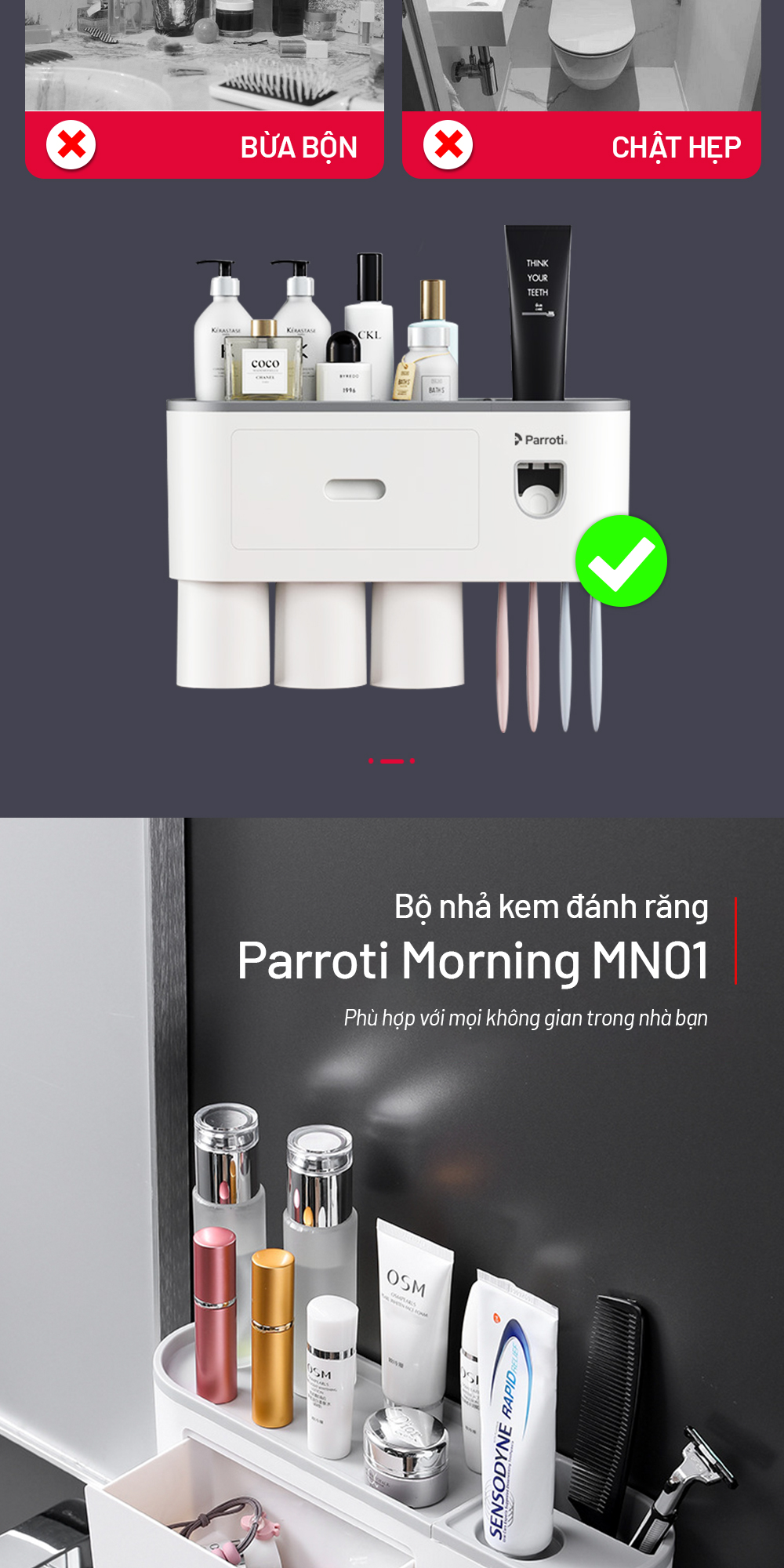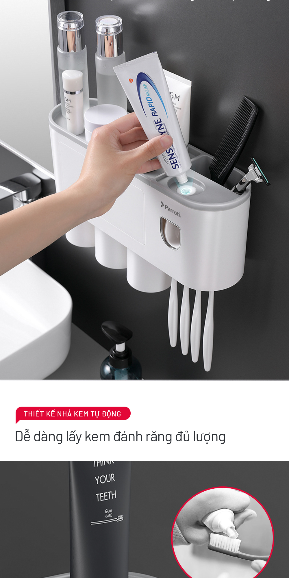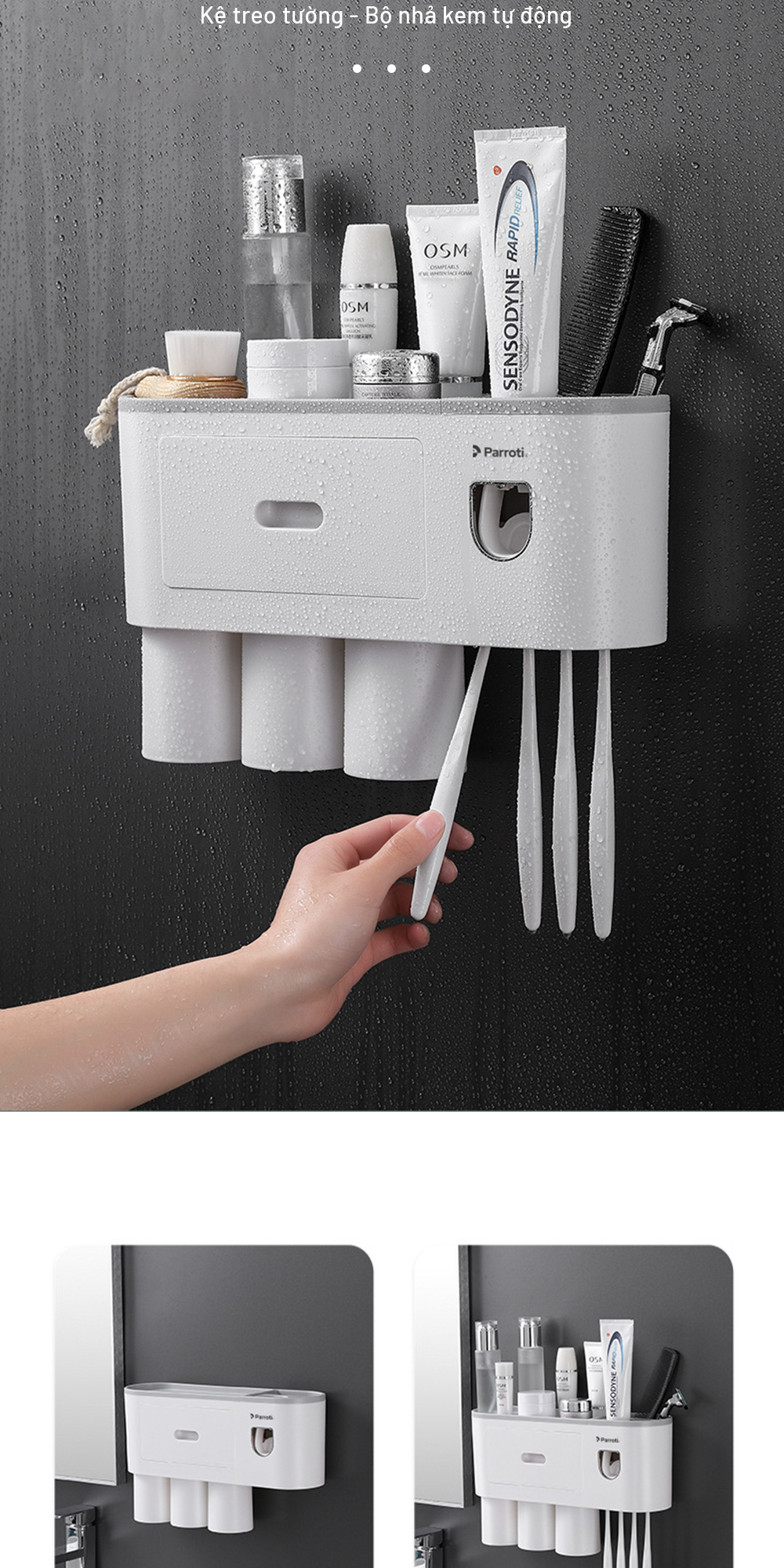 Bộ Nhả Kem Đánh Răng Thông Minh Parroti Morning, bộ nhả kem đánh răng kiêm để bàn chải kèm cốc hút nam châm tiện lợi. Thiết kế các không gian để kem đánh răng, bàn chải, sữa tắm, gía điện thoại rất tinh tế và hiện đại.
