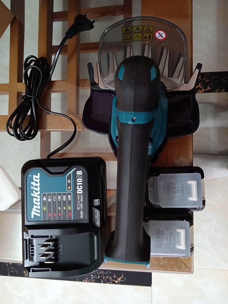 Trong hộp có: Máy tỉa hàng rào Makita UM600DSYE, Bảo vệ lưỡi, khay chứa cỏ 160, 2 pin 12V 1.5Ah, 1 sạc nhanh.