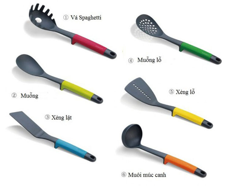 Joseph Joseph 10119 bao gồm: Muỗng có rãnh, máy phục vụ mì Ý, muỗng đặc, dao trộn có rãnh, dao xoay dẻo và muôi