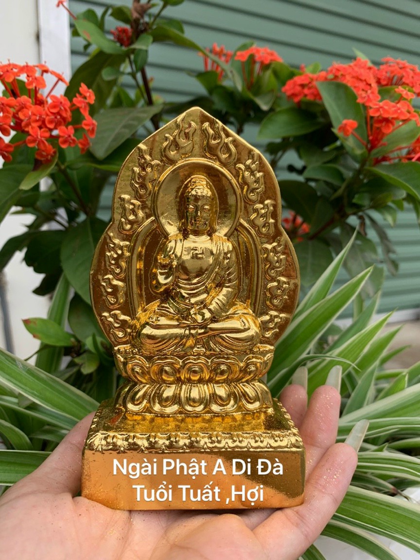 Tượng phật bản mệnh phật adi đà hợp tuổi ( Tuất ,hợi ) bằng gỗ bách xanh pu dát vàng cao cấp kt 14×8×4cm