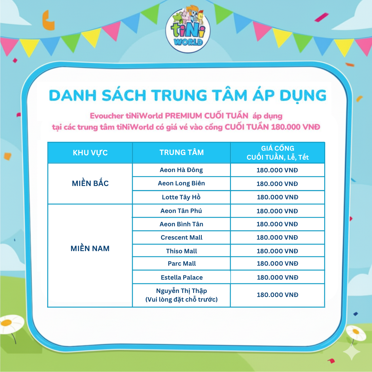 Vé vào cổng điện tử tiNiWorld PREMIUM CUỐI TUẦN/LỄ áp dụng tại các trung tâm tiNiWorld có giá vé vào cổng 180.000 VNĐ