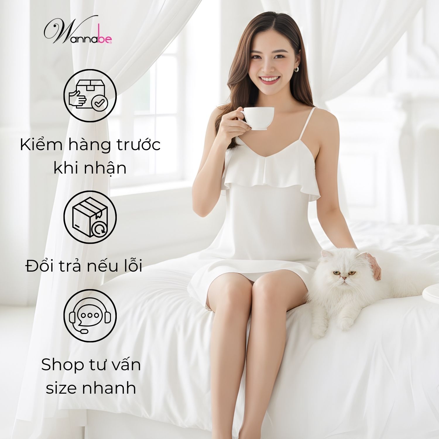 Đổi đầm ngủ miễn phí nếu sản phẩm bị lỗi từ WANNABE (quý khách vui lòng quay video mở hàng để WANNABE hỗ trợ