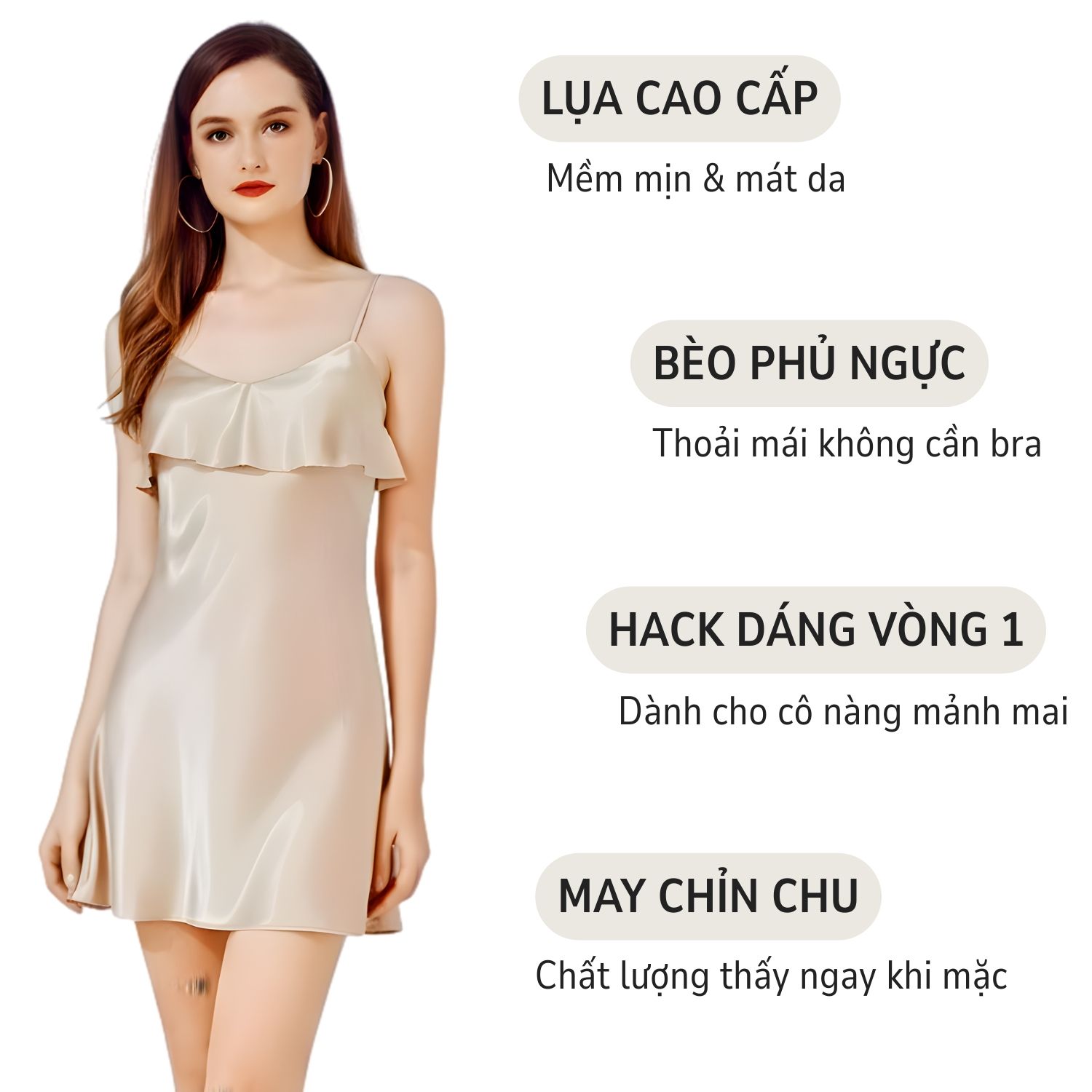 Kiểu dáng: váy ngủ 2 dây, chữ A, cổ chữ V không kén dáng người mặc