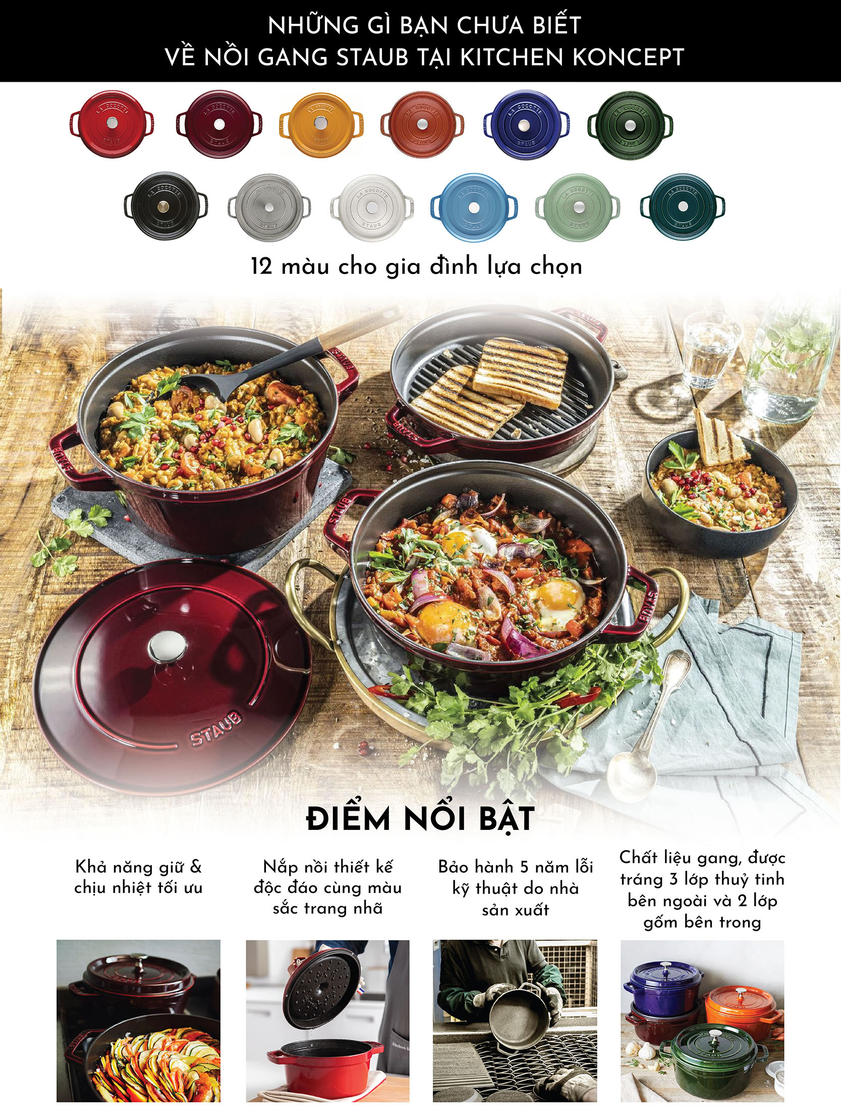 Staub - Nồi tròn màu đỏ cherry được sản xuất hoàn toàn tại Pháp, bằng việc kết hợp giữa các yếu tố truyền thống và hiện đại. Mang đên cho bạn những trải nghiệm tuyệt vời khi chế biến các món ninh, hầm, áp chảo.
