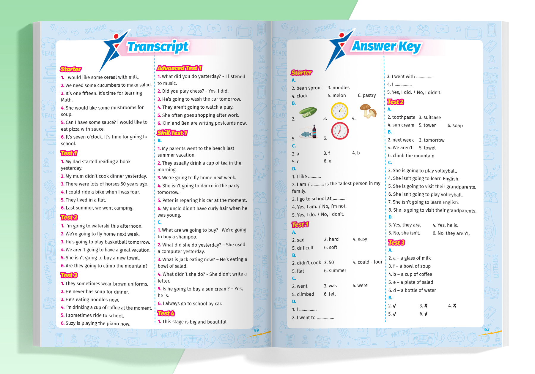 • Đối với các bài kiểm tra tổng hợp 2 (Skill Test): 1 bài kiểm tra về từ vựng, 2 bài kiểm tra kĩ năng Nghe và 2 bài kiểm tra kĩ năng Đọc – Viết, 1 bài kiểm tra kĩ năng Nói.
