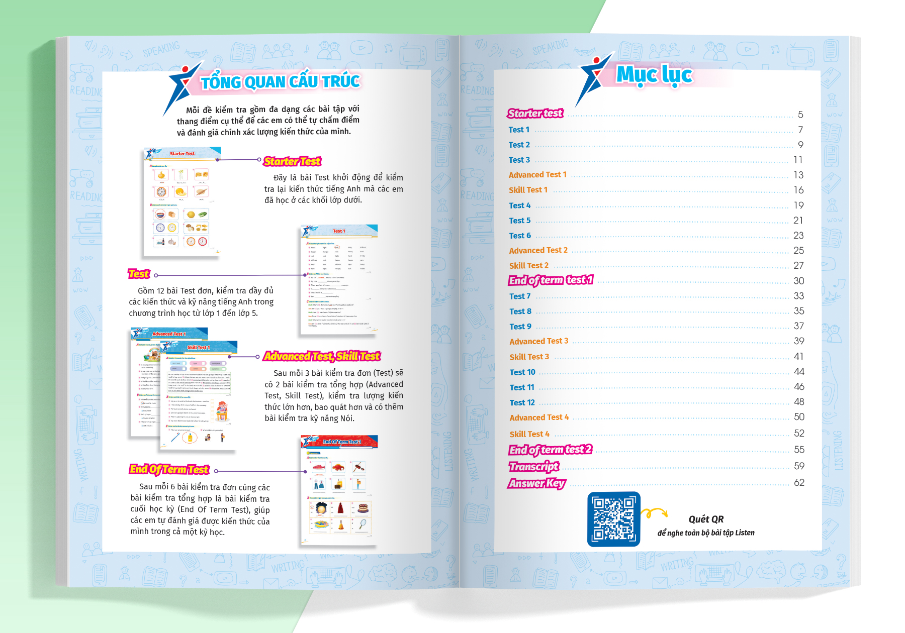 Bộ sách cung cấp các bài kiểm tra từ cơ bản đến nâng cao, bao gồm nhiều loại bài kiểm tra khác nhau, bao gồm kiểm tra từ vựng, kỹ năng nghe, đọc, viết và nói. Điều này giúp học sinh phát triển toàn diện các kỹ năng Tiếng Anh của họ và kiểm tra tất cả các khía cạnh của môn học.
