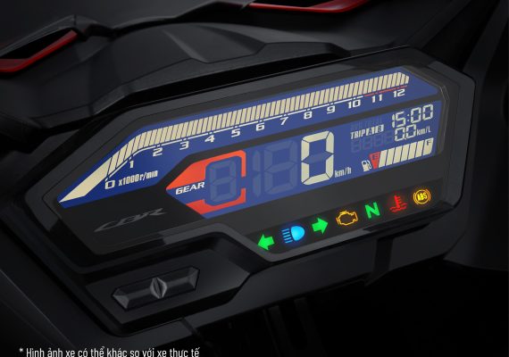 TCụm đồng hồ kỹ thuật số màn hình màu LCD được bố trí hiển thị các thông số kỹ thuật như tốc độ, vòng tua máy, thời gian, báo xăng và xi nhan cho khách hàng dễ dàng quan sát lựa chọn sử dụng khi vận hành xe trên đường.