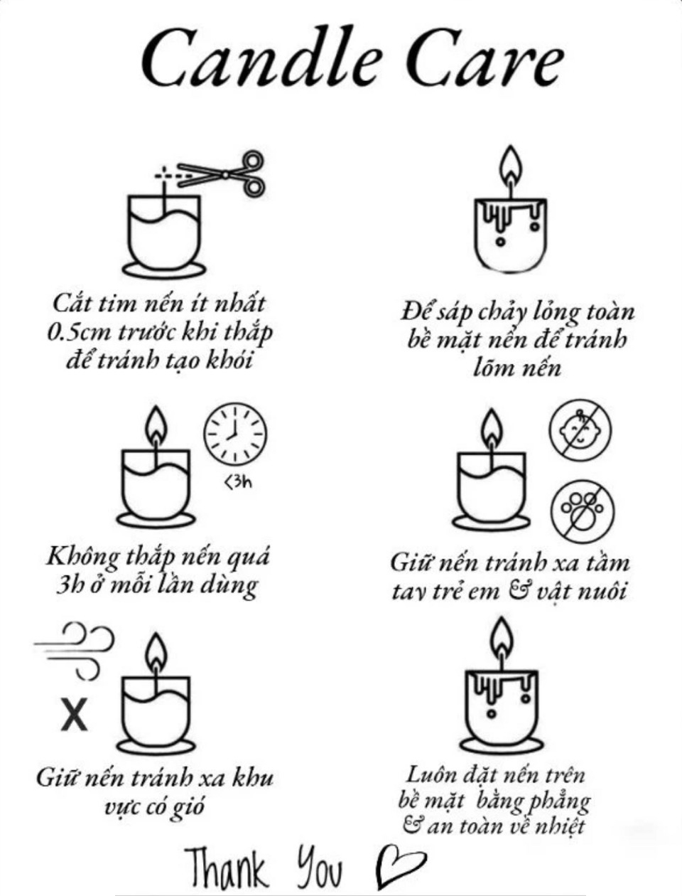 c)Thời gian đốt cháy của Nến phụ thuộc nhiều vào ngọn lửa to hoặc nhỏ khi đốt. Việc cắt tim (bấc) nến thường xuyên để điều chỉnh ngọn nến là cần thiết.