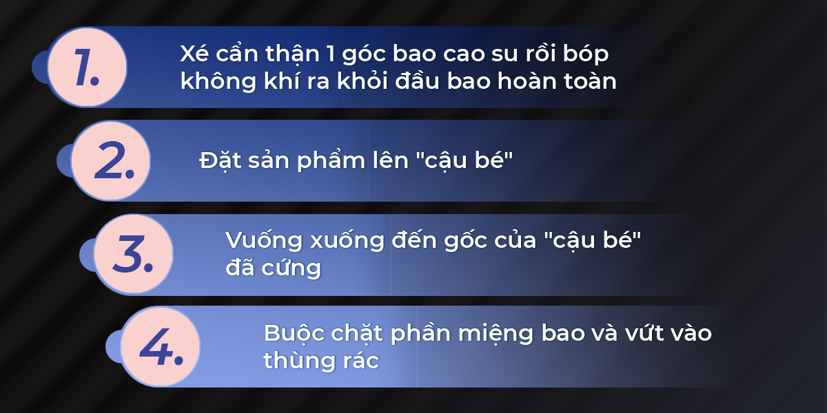 ✪ Cách dùng: Bạn tiến hành xé một góc nhỏ trên vỏ bao cao su. Sau đó, hãy dùng tay bóp phần đầu bao để đuổi hết không khí bên trong ra ngoài. Tiếp đến, bạn đặt bao cao su lên trên đầu khấc và kéo xuống dưới gốc. Sau khi quan hệ xong, bạn nhẹ nhàng rút bao ra, buộc chặt phần miệng bao và cho vào thùng rác.