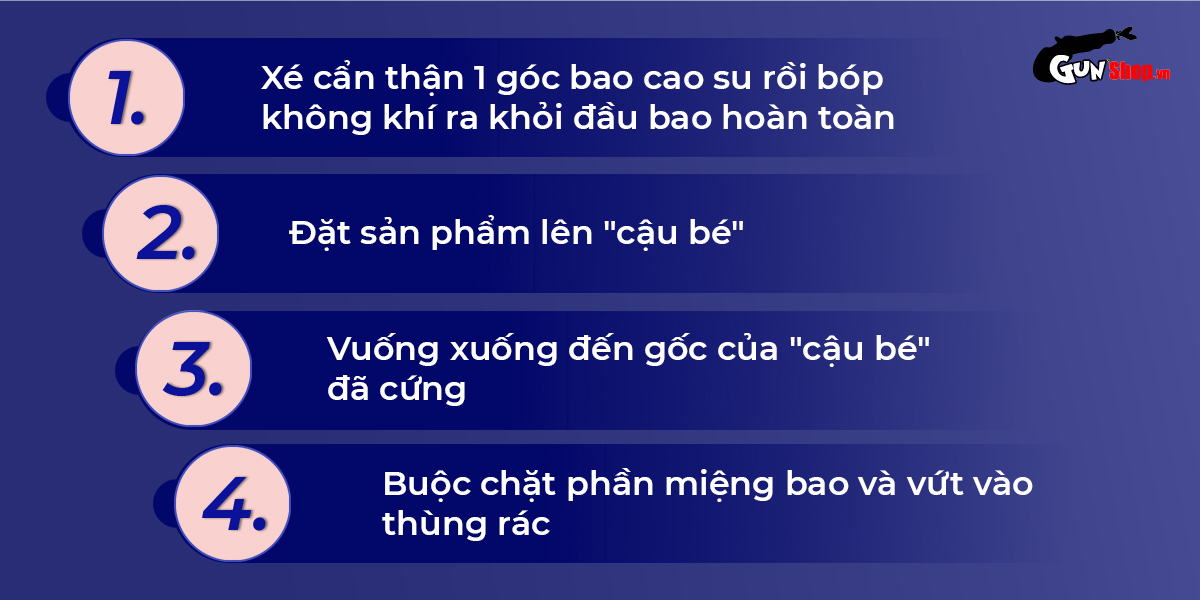 ✪ Cách dùng: Xé cẩn thận 1 góc bao cao su rồi bóp không khí ra khỏi đầu bao hoàn toàn. Sau đó đặt sản phẩm lên đầu khấc, vuốt xuống đến gốc. Khi quan hệ xong rút ra nhẹ nhàng, buộc chặt phần miệng bao và vứt vào thùng rác.