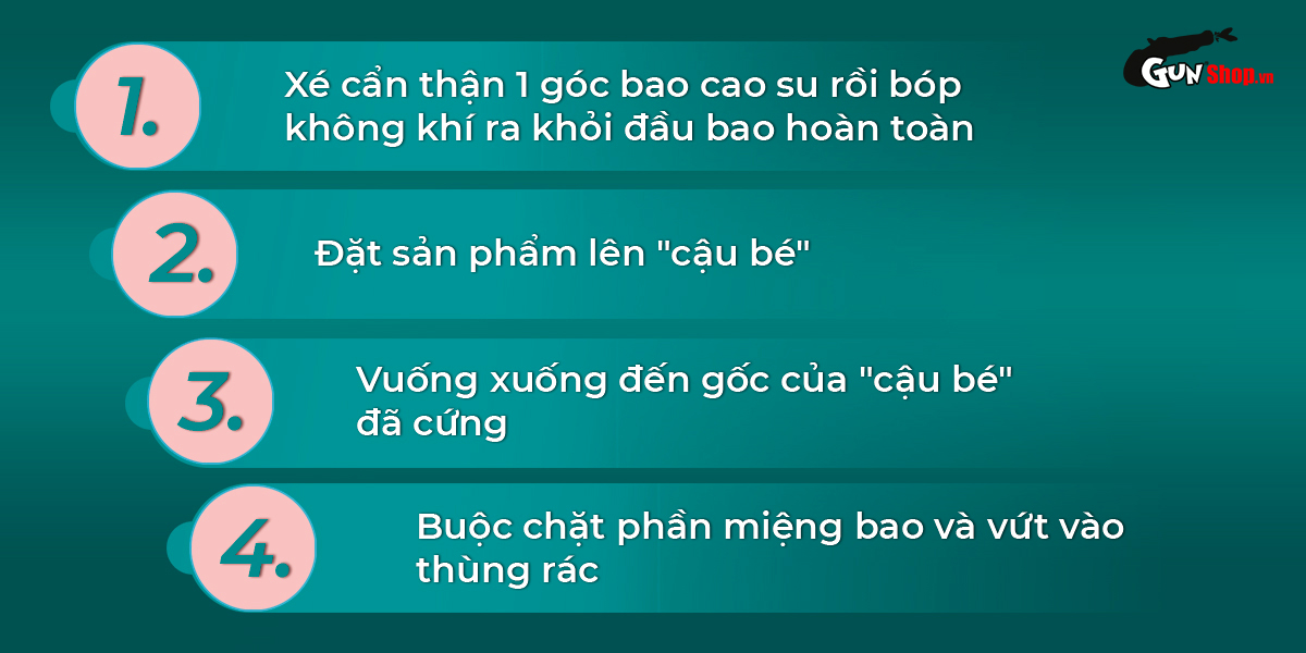 ✪ Cách dùng: Cẩn thận xé 1 góc bao cao su rồi bóp không khí ra khỏi đầu bao, sau đó đặt bao vào đầu rồi vuốt xuống đến gốc. Sau khi quan hệ xong giữ đầu bao rồi từ từ rút ra tránh làm tràn tinh dịch. Thắt miệng bao rồi vứt vào thùng rác.