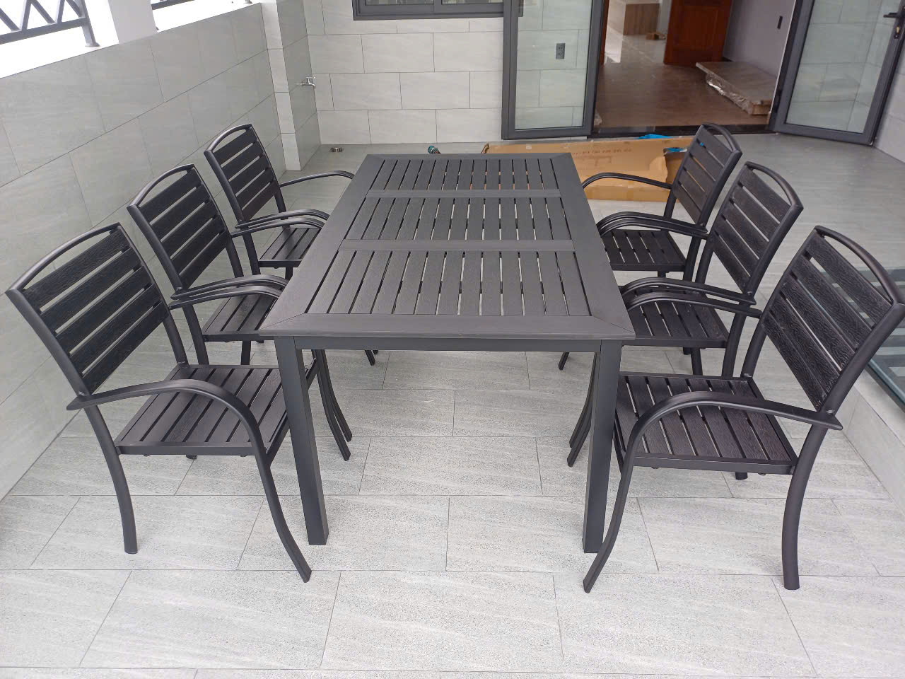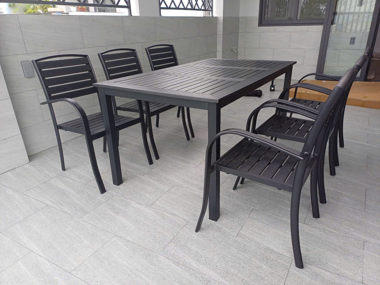 - Chất liệu bàn và ghế: thanh gỗ nhựa Polywood, khung nhôm sơn tĩnh điện