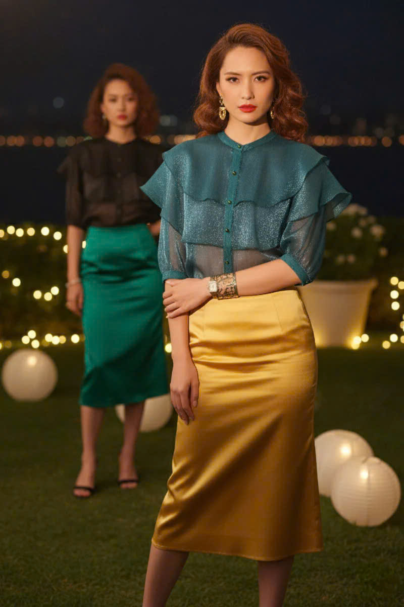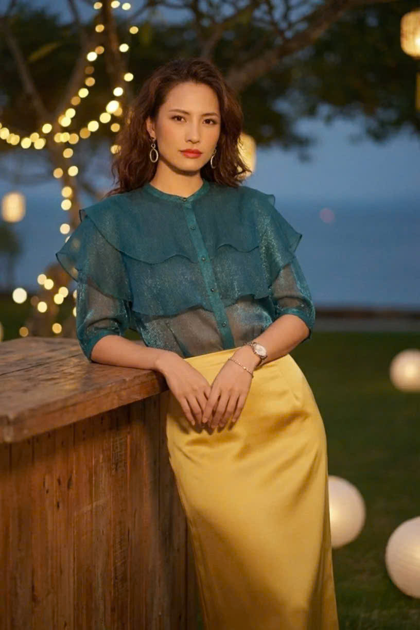 Sắc xanh ngọc lục bảo biếc thẳm tạo nên tấm áo xuyên thấu organza du dương như một bản giao hưởng của ánh sáng và chất liệu. Từng đường bèo nhún tinh tế, xếp tầng khéo léo, gợi lên vẻ đẹp cổ điển lãng mạn nhưng không kém phần hiện đại, kiêu sa. Dưới ánh đèn vàng dịu nhẹ của đêm tiệc, chất liệu organza lấp lánh như có ngàn vì sao ẩn mình, tạo nên chiều sâu hút mắt và sự chuyển động mềm mại theo từng cử chỉ của người mặc.