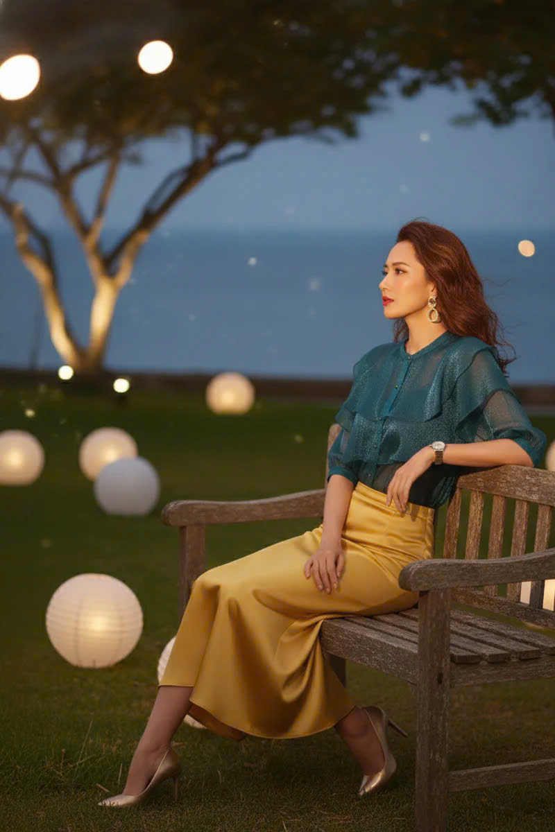 Mỗi chi tiết đều như được chọn đúng chỗ: vạt váy chạm gió, chất vải trượt nhẹ trên da, đường may tinh tế nâng niu dáng vóc. Nhưng điều khiến mọi ánh nhìn dừng lại chẳng phải là trang phục. Chính là cách ta bước đi, không vội vàng, không phô bày, chỉ cần hiện diện là đủ.