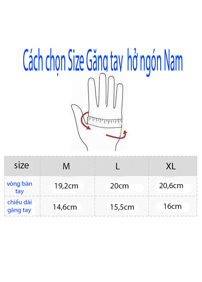 Găng tay nam hở ngón cao cấp BHYST37 có size M L XL để phù hợp với mỗi tay bạn hãy đo tay theo ảnh hướng dẫn để chọn vừa tay nhất