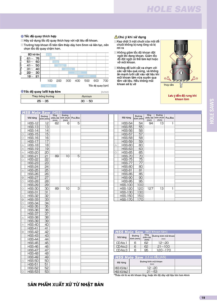 SỬ DỤNG: TẤM THÉP ( đến 3.2 mm), ALUMINUM ( đến 3.2 mm), GỖ, FRP, PLASTIC. Lò xo đẩy phôi (các size từ 53mm trở xuống có gắn lò xo đẩy phôi) Mũi khoét thép gió HS-S là gì?