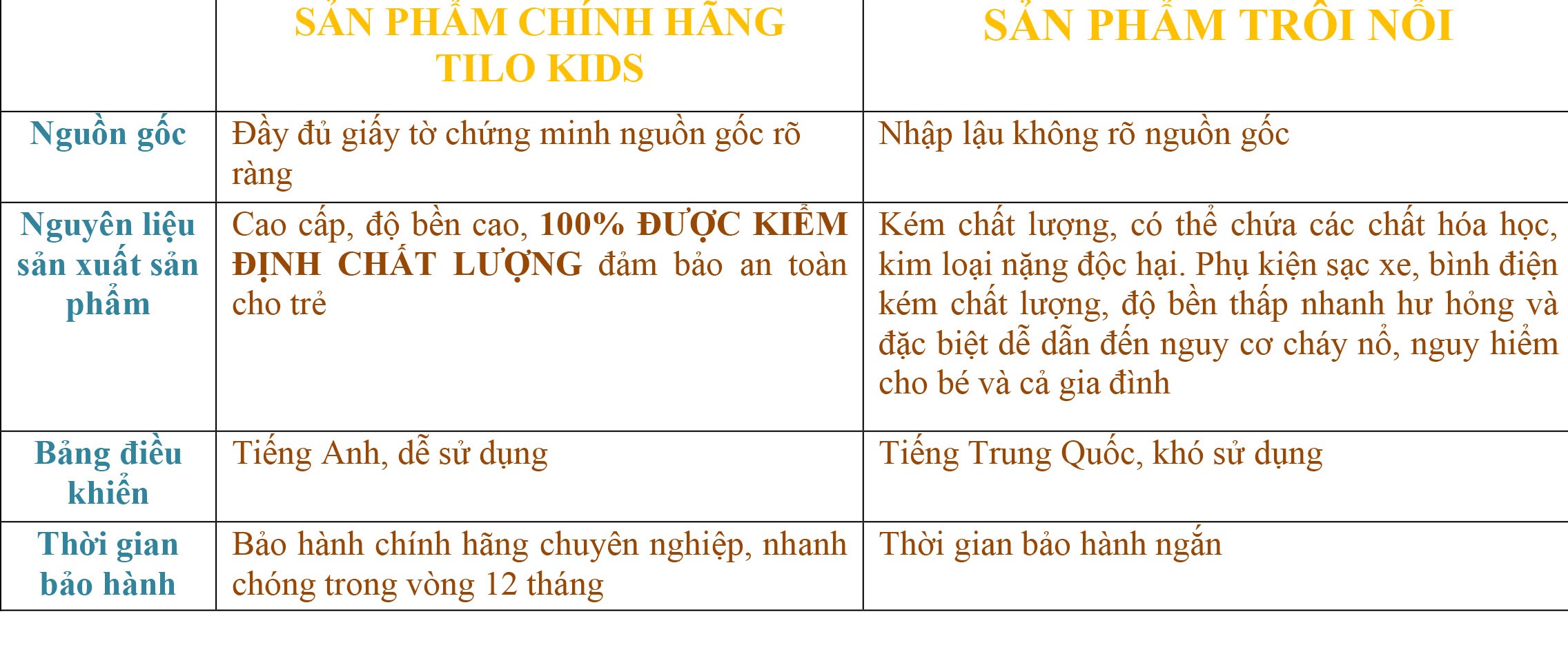 SỰ KHÁC BIỆT GIỮA SẢN PHẨM XE ĐIỆN TRẺ EM CHÍNH HÃNG TILO KIDS VÀ SẢN PHẨM TRÔI NỔI KHÔNG RÕ NGUỒN GỐC