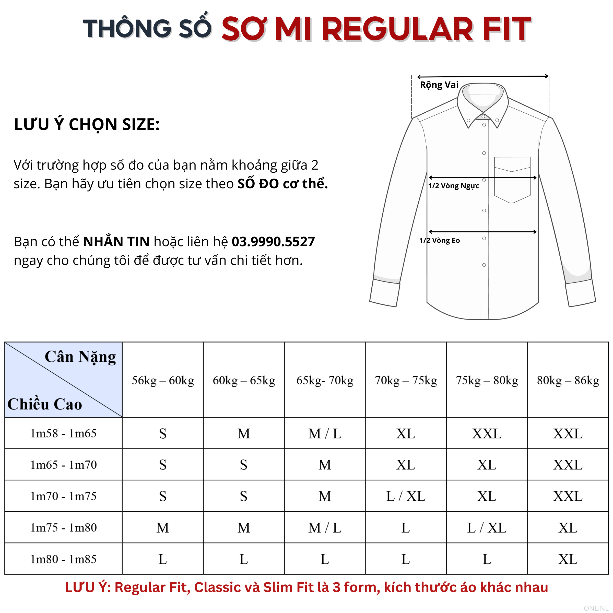 1. Có 3 dáng áo CLASSIC / REGULAR FIT / SLIM FIT với thông số khác nhau, khách hàng lưu ý kỹ thông tin, size số sản phẩm.