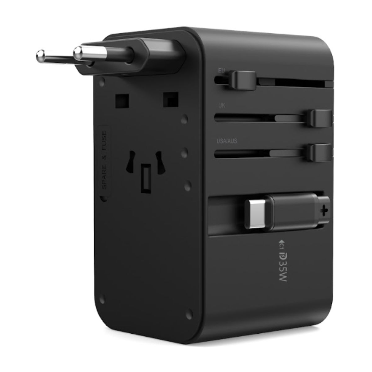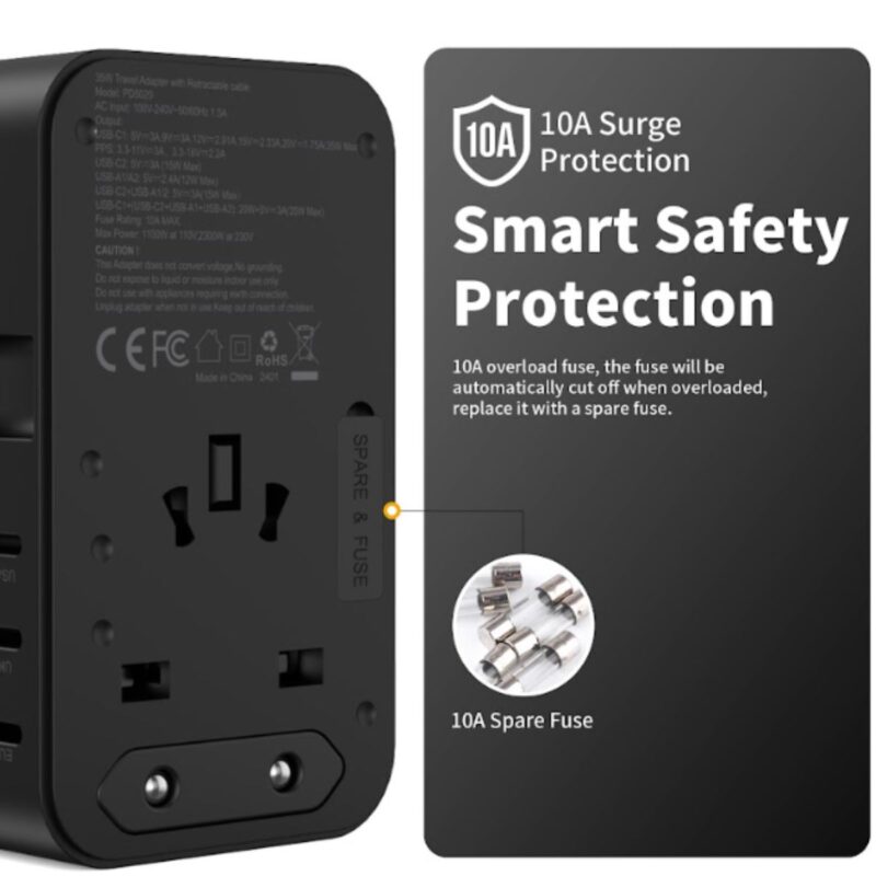 -Bộ sản phẩm đi kèm đến 4 chuẩn jack cắm, là 4 chuẩn ổ cắm phổ biến được các quốc gia trên thế giới sử dụng hiện nay. Việc cho phép thay đổi đầu cắm khác, cho phép người dùng có thể sử dụng bộ sạc ở hơn 200 quốc gia và khu vực khác nhau trên thế giới mà không gặp vấn đề gì.