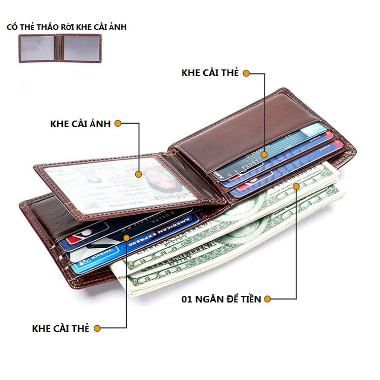 Bên cạnh đó, thiết kế thông minh với ngăn ở giữa rộng rãi giúp bạn để những tờ tiền một cách phẳng phiu, còn hai bên cạnh là những ngăn nhỏ tiện dụng, bạn có thể cất những tấm thẻ ngân hàng hay giấy tờ tùy thân một cách dễ dàng.